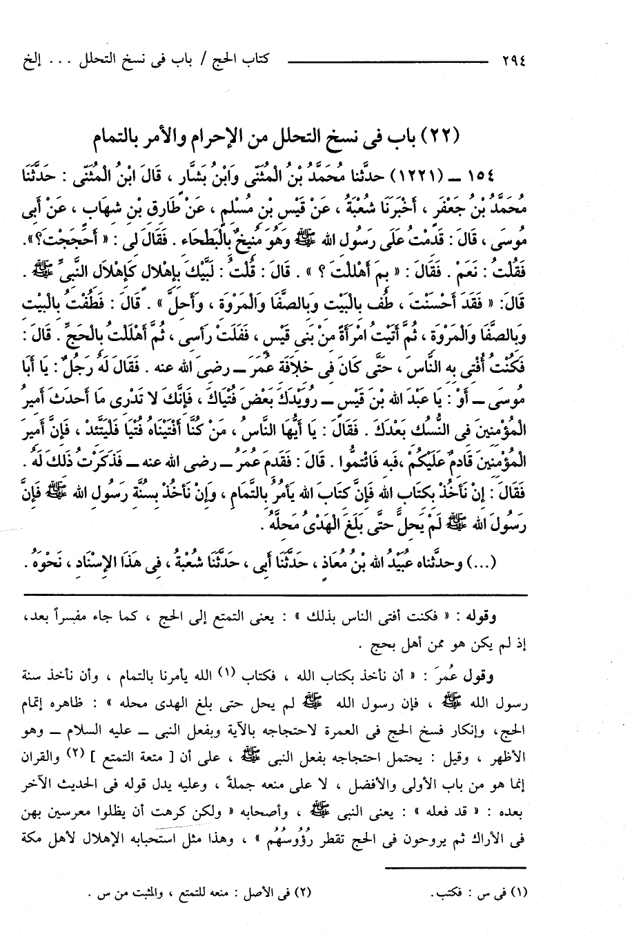 154 - (1221) حدَّثنا مُحَمَّدُ بْنُ الْمُثَنَّى وَابْنُ بَشَّارٍ، قَالَ ابْنُ الْمُثَنَّى: حَدَّثَنَا مُحَمَّدُ بْنُ جَعْفَرٍ، أَخْبَرَنَا شُعْبَةُ، عَنْ قَيْسِ بْن مُسْلِمٍ، عَنْ طَارِقِ بْنِ شِهَابٍ، عَنْ أَبِى مُوسَى، قَالَ: قَدِمْتُ عَلَى رَسُولِ اللهِ صَلَّى اللهُ عَلَيْهِ وَسَلَّمَ وَهُوَ مُنِيخٌ بِالْبَطْحَاءِ. فَقَالَ لِى: " أَحَجَجْتَ؟ ". فَقُلْتُ: نَعَمْ. فَقَالَ: " بِمَ أَهْلَلْتَ؟ ". قَالَ: قُلْتُ: لَبَّيْكَ بِإِهْلالٍ كَإِهْلَالِ النَّبِىِّ صَلَّى اللهُ عَلَيْهِ وَسَلَّمَ. قَالَ: " فَقَدَ أَحْسَنْتَ، طُف بِالْبَيْتِ وَبِالصَّفَا وَالْمَرْوَةِ، وَأَحَلَّ ". "قَالَ: فَطُفْتُ بِالْبيْتِ وَبِالصَّفَا وَالْمَرْوَةِ، ثُمَّ أَتَيْتُ امْرَأَةً مِنْ بَنىِ قَيْسٍ، فَفَلَتْ رَأْسِى، ثُمَّ أَهْلَلْتُ بِالْحَجِّ. قَالَ: فَكُنْتُ أُفْتِى بِهِ النَّاسَ، حَتَّى كَانَ فِى خِلَافَةِ عمَرَ - رَضِىَ اللهُ عَنْهُ. فَقَالَ لَه رَجُلٌ: يَا أَبَا مُوسَى - أَوْ: يَا عَبْدَ اللهِ بْنَ قَيْسٍ - رُوَيْدَكَ بَعْضَ فُتْيَاكَ، فَإِنَّكَ لا تَدْرِى مَا أَحْدَثَ أَمِيرُ الْمُؤْمِنِينَ فِى النُّسُكِ بَعْدَكَ. فَقَالَ: يَا أَيُّهَا النَّاسُ، مَنْ كُنَّا أَفْتَيْنَاهُ فُتْيَا فَلْيَتَّئِدْ، فَإِنَّ أَمِيرَ الْمُؤْمِنِينَ قَادِمٌ عَلَيْكُمْ، فَبِه فَائْتمُّوا. قَالَ: فَقَدِمَ عُمَرُ - رَضِىَ اللهُ عَنْهُ - فَذَكَرْتُ ذَلِكَ لَهُ. فَقَالَ: إِنْ نَأَخُذْ بِكِتَابِ اللهِ فَإِنَّ كِتَابَ اللهِ يَأْمُرُ بِالتَّمَامِ، وَإِنْ نَأخُذْ بِسُنَّةِ رَسُولِ اللهِ صَلَّى اللهُ عَلَيْهِ وَسَلَّمَ فَإِنَّ رَسُولَ اللهِ صَلَّى اللهُ عَلَيْهِ وَسَلَّمَ لَمْ يَحِلَّ حتَّى بَلَغَ الْهَدِىُ مَحِلَّهُ.