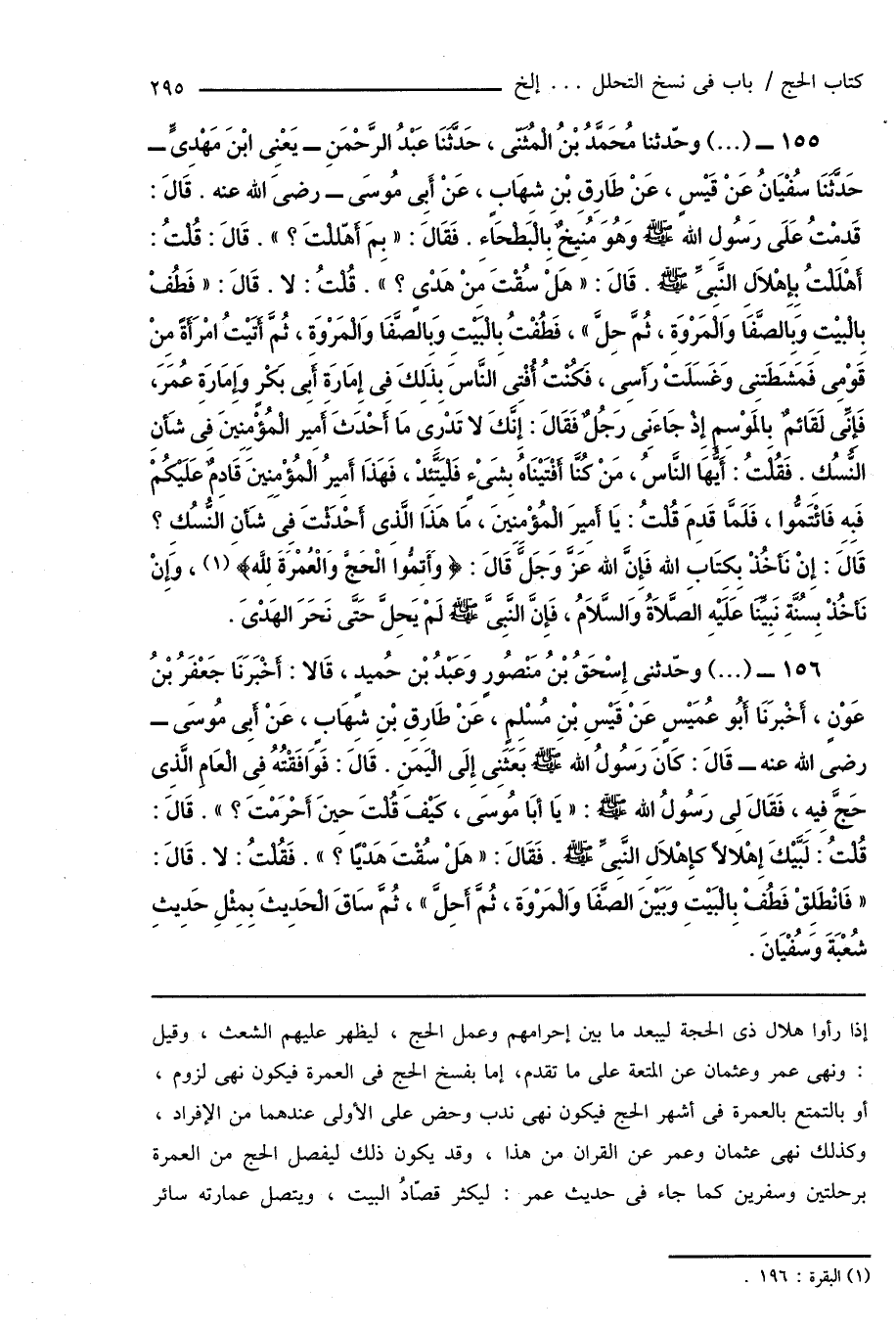 155 - (...) وحدّثنا مُحَمَّدُ بْنُ الْمُثَنَّى، حَدَّثَنَا عَبْدُ الرَّحْمَنِ - يَعْنِى ابْنَ مَهْدِىٍّ - حَدَّثَنَا سُفْيَانُ عَنْ قَيْسٍ، عَنْ طَارِقِ بْنِ شِهَابٍ، عَنْ أَبِى مُوسَى - رَضِىَ اللهُ عَنْهُ. قَالَ: قَدِمْتُ عَلَى رَسُولِ اللهِ صَلَّى اللهُ عَلَيْهِ وَسَلَّمَ وَهُوَ مُنِيخٌ بِالْبَطْحَاءِ. فَقَالَ: " بِمَ أَهْلَلْتَ؟ ". قَالَ: قُلْتُ: أَهْلَلْتُ بِإِهْلَالِ النَّبِىِّ صَلَّى اللهُ عَلَيْهِ وَسَلَّمَ. قَالَ: " هَل سُقْتَ مِنْ هَدْىٍ؟ ". قُلْتُ: لا. قَالَ: " فَطُفْ بِالْبَيْتِ وَبِالصَّفَا وَالْمَرْوَةِ، ثُمَّ حِلَّ "، فَطُفْتُ بِالْبَيْتِ وَبِالصَّفَا وَالْمَرْوَةِ، ثُمَّ أَتَيْتُ امْرَأَةً مِنْ قَوْمِى فَمَشَطَتنِى وَغَسَلَتْ رَأْسِى، فَكُنْتُ أُفْتِى النَّاسَ بِذَلِكَ فى إِمَارَةِ أَبِى بَكْرٍ وَإِمَارَةِ عُمَرَ، فَإِنِّى لَقَائِمٌ بِالمَوْسِمِ إِذْ جَاءَنِى رَجُلٌ فَقَالَ: إِنَّكَ لا تَدْرِى مَا أَحْدَثَ أَمِير الْمُؤْمِنِينَ فِى شَأْنِ النُّسُكِ. فَقُلْتُ: أَيُّهَا النَّاسُ، مَنْ كُنَّا أَفْتَيْنَاهُ بِشَىْءٍ فَليَتَّئِدْ، فَهَذَا أَمِيرُ الْمُؤْمِنِينَ قَادِمٌ عَلَيْكُمْ فَبِهِ فَائْتَمُّوا، فَلَمَّا قَدِمَ قُلْتُ: يَا أَمِيرَ الْمُؤْمِنِينَ، مَا هَذَا الَّذِى أَحْدَثْتَ فِى شَأْنِ النُّسُكِ؟ قَالَ: إِنْ نَأْخُذْ بِكِتَابِ اللهِ فَإِنَّ اللهَ عَزَّ وَجَلَّ قَالَ: {وَأَتِمُّوا الْحَجَّ وَالْعُمْرَةَ لِلَّه} (¬1)، وَإِنْ نَأْخُذْ بِسُنَّةِ نَبِيِّنَا عَلَيْهِ الصَّلَاةُ وَالسَّلَامُ، فَإِنَّ النَّبِىَّ صَلَّى اللهُ عَلَيْهِ وَسَلَّمَ لَمْ يَحِلَّ حَتَّى نَحَرَ الهَدْىَ.