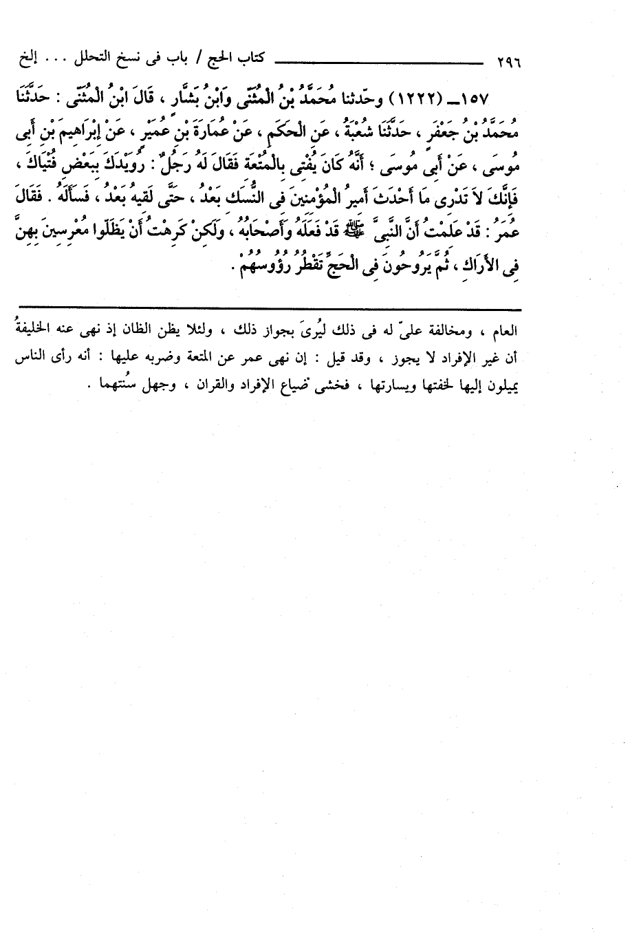 157 - (1222) وحدّثنا مُحَمَّدُ بْنُ الْمُثَنَّى وَابْنُ بَشَّارٍ، قَالَ ابْنُ الْمُثَنَّى: حَدَّثَنَا مُحَمَّدُ بْنُ جَعْفَرٍ، حَدَّثَنَا شُعْبَةُ، عَنِ الْحَكَمِ، عَنْ عُمَارَةَ بْنِ عُمَيْرٍ، عَنْ إِبْرَاهِيمَ بْنِ أَبِى مُوسَى، عَنْ أَبِى مُوسَى؛ أَنَّهُ كَانَ يُفْتِى بِالْمُتْعَةِ فَقَالَ لَهُ رَجُلٌ: رُوَيْدَكَ بِبَعْضِ فُتْيَاكَ، فَإِنَّكَ لَا تَدْرِى مَا أَحْدَثَ أَمِيرُ الْمُؤْمِنِينَ فِى النُّسُكِ بَعْدُ، حَتَّى لَقِيهُ بَعْدُ، فَسَأَلَهُ. فَقَالَ عُمَرُ: قَدْ عَلِمْتُ أَنَّ النَّبِىَّ صَلَّى اللهُ عَلَيْهِ وَسَلَّمَ قَدْ فَعَلَهُ وَأَصْحَابُهُ، وَلَكِنْ كَرِهْتُ أَنْ يَظَلّوا مُعْرِسِينَ بِهِنَّ فِى الأَرَاكِ، ثُمَّ يَرُوحُونَ فِى الْحَجِّ تَقْطُرُ رُؤُوسُهُمْ.
