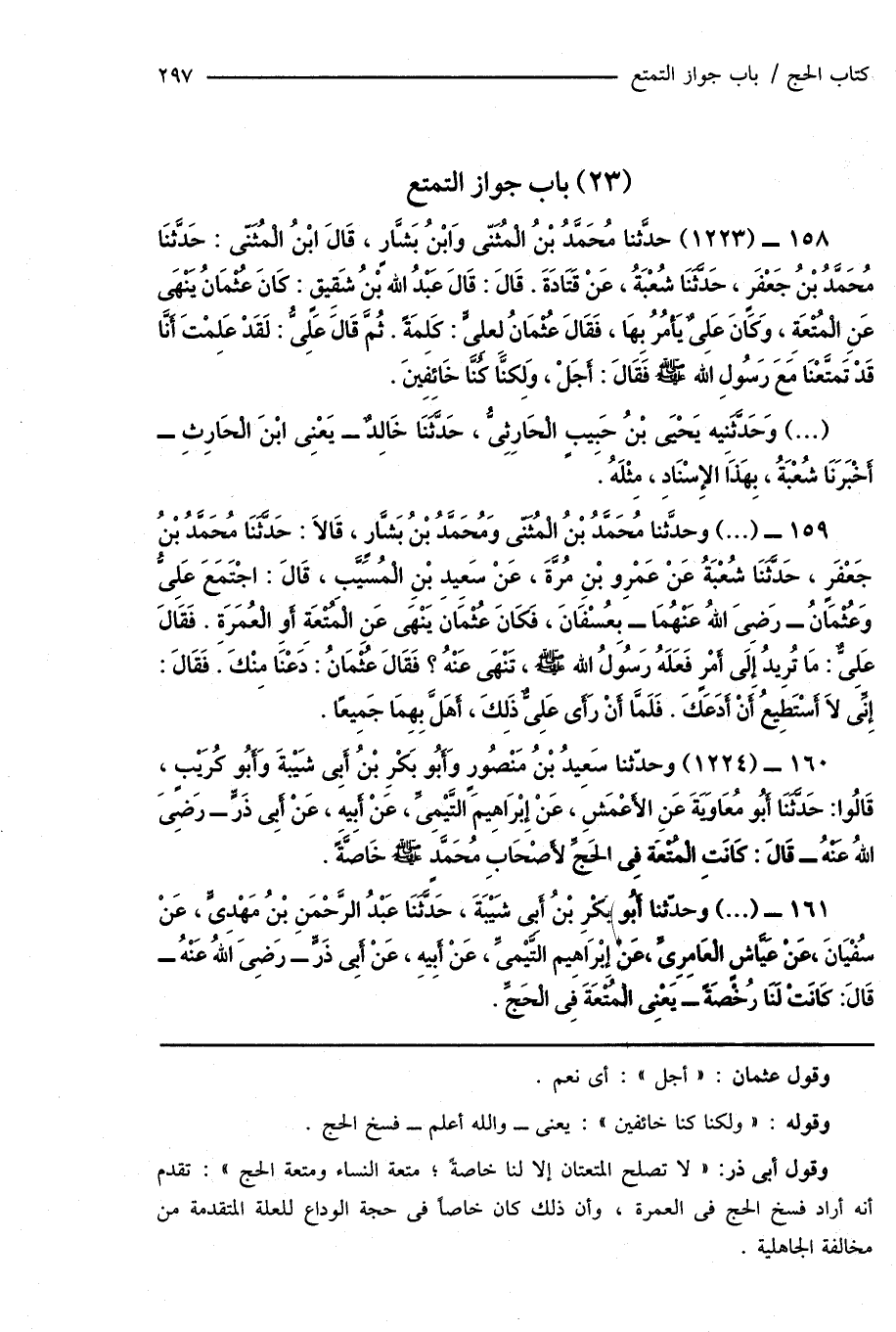 159 - (...) وحدَّثنا مُحَمَّدُ بْنُ الْمُثَنَّى وَمُحَمَّدُ بْنُ بَشَّارٍ، قَالَا: حَدَّثَنَا مُحَمَّدُ بْنُ جَعْفَرٍ، حَدَّثَنَا شُعْبَةُ عَنْ عَمْرِو بْنِ مُرَّةَ، عَنْ سَعِيدِ بْنِ الْمُسَيّبِ، قَالَ: اجْتَمَعَ عَلِىٌّ وَعُثْمَانُ - رَضِىَ اللهُ عَنْهُمَا - بِعُسْفَانَ، فَكَانَ عُثْمَان يَنْهَى عَن الْمُتْعَةِ أَوِ الْعُمَرَةِ. فَقَالَ عَلِىٌّ: مَا تُرِيدُ إِلَى أمْرٍ فَعَلَهُ رَسُولُ اللهِ صَلَّى اللهُ عَلَيْهِ وَسَلَّمَ، تَنْهَى عَنْهُ؟ فَقَالَ عُثْمَانُ: دَعْنَا مِنْكَ. فَقَالَ: إِنِّى لَا أَسْتَطِيعُ أَنْ أَدَعَكَ. فَلَمَّا أَنْ رَأَى عَلِىٌّ ذَلِكَ، أَهَلَّ بِهِمَا جَمِيعًا.