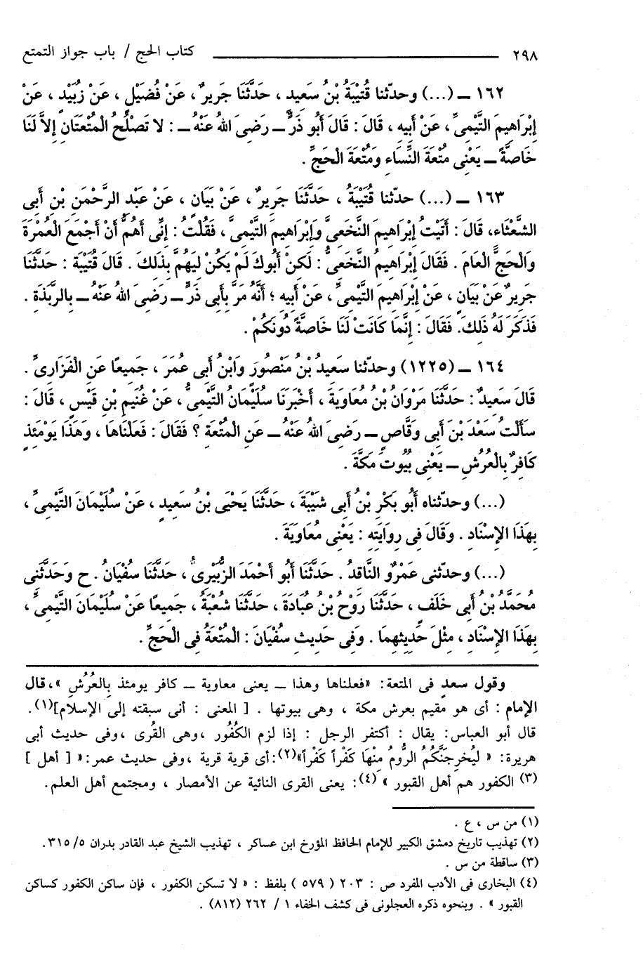 164 - (1225) وحدّثنا سَعِيدُ بْنُ مَنْصُورٍ وَابْنُ أَبِى عُمَرَ، جَمِيعًا عَنِ الْفَزَارِىِّ. قَالَ سَعِيدٌ: حَدَّثَنَا مَرْوَانُ بْنُ مُعَاوِيَةَ، أَخْبَرَنَا سُلَيْمَانُ التَّيْمِىُّ، عَنْ غُنَيمِ بْنِ قَيْسٍ، قَالَ: سَأَلْتُ سَعْدَ بْنَ أَبِى وَقَّاصٍ - رَضِىَ اللهُ عَنْهُ - عَنِ الْمُتْعَةِ؟ فَقَالَ: فَعَلْنَاهَا، وَهَذَا يَوْمَئِذٍ كَافِرُ بِالْعُرُشِ - يَعْنِى بُيُوتَ مَكَّةَ.