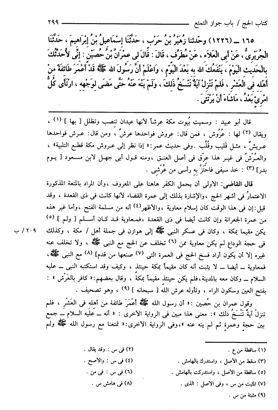 165 - (1226) وحدّثنا زُهَيْرُ بْنُ حَرْبٍ، حَدَّثَنَا إِسْمَاعِيلُ بْنُ إِبْرَاهِيمَ، حَدَّثَنَا الْجُرَيْرِىُّ، عَنْ أَبِى الْعَلَاءِ، عَنْ مُطَرِّفٍ، قَالَ: قَالَ لِى عِمْرَانُ بْنُ حُصَيْنٍ: إِنِّى لأُحَدِّثُكَ بِالْحَدِيثِ الْيَوْمَ، يَنْفَعُكَ الله بِهِ بَعْدَ الْيَوْمِ، وَاعْلَمْ أَنَّ رَسُولَ اللهِ صَلَّى اللهُ عَلَيْهِ وَسَلَّمَ قَدْ أَعْمَرَ طَائِفَةً مِنْ أَهْلِهِ فِى الْعَشْرِ، فَلمْ تَنْزِلْ آيَةٌ تَنْسَخُ ذَلِكَ، وَلَمْ يَنْهَ عَنْهُ حَتَّى مَضَى لِوَجْهِهِ، ارْتَأَى كُلُّ امْرِئٍ بَعْدُ، مَا شَاءَ أَنْ يَرْتَئىَ.