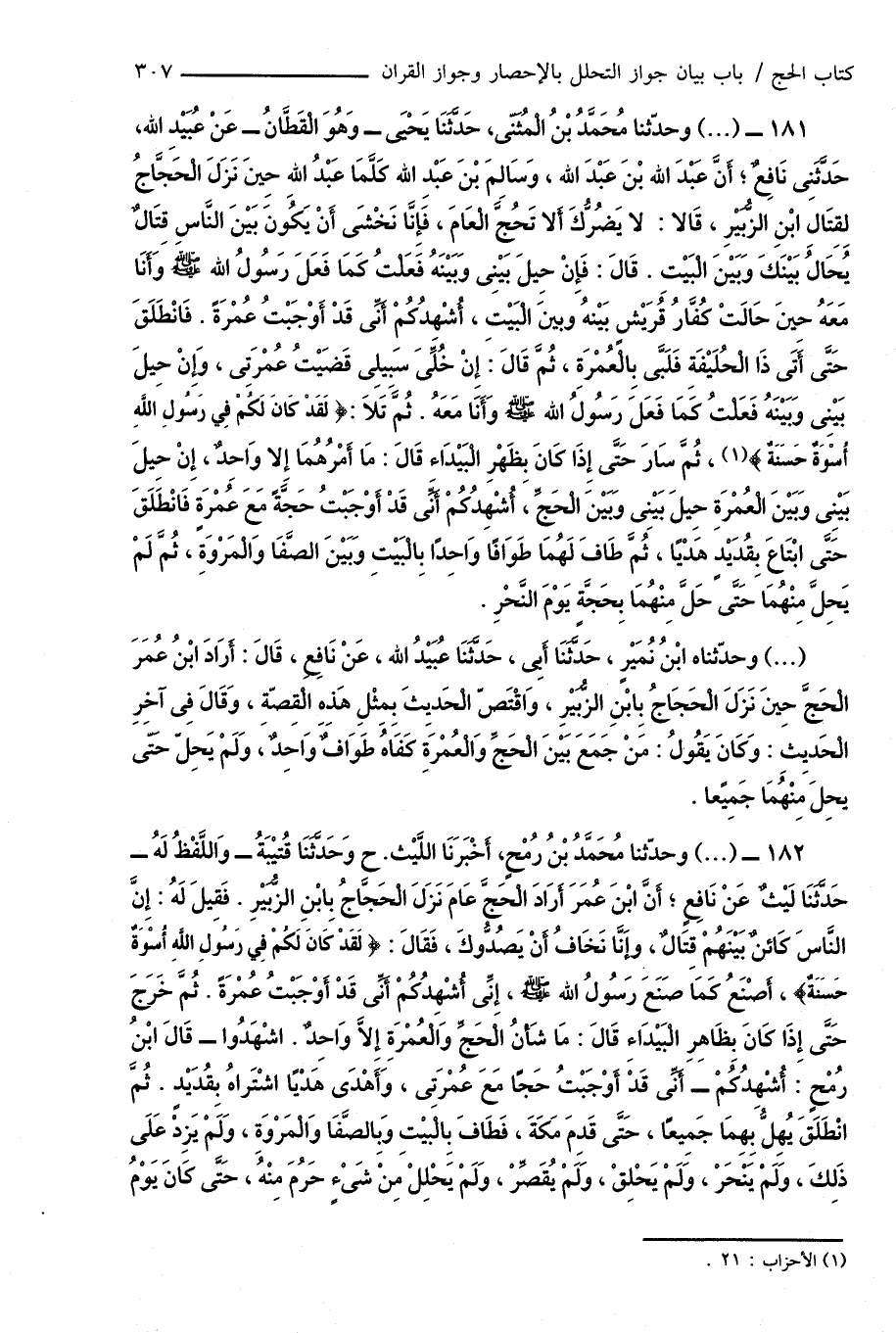 181 - (...) وحدّثنا مُحَمَّدُ بْنُ الْمُثَنَّى، حَدَّثَنَا يَحْيَى - وَهُوَ الْقَطَّانُ - عَنْ عُبَيْدِ اللهِ، حَدَّثَنِى نَافِعٌ؛ أَنَّ عَبْدَ اللهِ بْنَ عَبْدَ اللهِ، وَسَالِمَ بْنَ عَبْدِ اللهِ كَلَّمَا عَبْدُ اللهِ حِينَ نَزَلَ الْحَجَّاجُ لِقِتَالِ ابْنِ الزُّبَيْرِ، قَالا: لا يَضُرُّكَ أَلا تَحُجَّ الْعَامَ، فَإِنَّا نَخْشَى أَنْ يَكُونَ بَيْنَ النَّاسِ قِتَالٌ يُحَالُ بَيْنَكَ وَبَيْنَ الْبَيْتِ. قَالَ: فَإِنْ حِيلَ بَيْنِى وَبَيْنَهُ فَعَلْتُ كَمَا فَعَلَ رَسُولُ اللهِ صَلَّى اللهُ عَلَيْهِ وَسَلَّمَ وَأَنَا مَعَهُ حِينَ حَالَتْ كُفَّارُ قُرَيْشٍ بَيْنَهُ وَبَيْنَ الْبَيْتِ، أُشْهِدُكُمْ أَنِّى قَدْ أَوْجَبْتُ عُمْرَةً. فَانْطَلَقَ حَتَّى أَتَى ذَا الْحُلَيْفَةِ فَلَبَّى بِالْعُمْرَةِ، ثُمَّ قَالَ: إِنْ خُلِّىَ سَبِيلِى قَضَيْتُ عُمْرَتِى، وَإِنْ حِيلَ بَيْنِى وَبَيْنَهُ فَعَلْتُ كَمَا فَعَلَ رَسُولُ اللهِ صَلَّى اللهُ عَلَيْهِ وَسَلَّمَ وَأَنَا مَعَهُ. ثُمَّ تَلَا: {لَقَدْ كَانَ لَكُمْ فِي رَسُولِ اللَّهِ أُسْوَةٌ حَسَنَةٌ} (¬1)، ثُمَّ سَارَ حَتَّى إِذَا كَانَ بِظَهْرِ الْبَيْدَاءِ قَالَ: مَا أَمْرُهُمَا إلا وَاحِدٌ، إِنْ حِيلَ بَيْنِى وَبَيْنَ الْعُمْرَةِ حِيلَ بَيْنِى وَبَيْنَ الْحَجِّ، أُشْهِدُكُمْ أَنِّى قَدْ أَوْجَبْتُ حَجَّةً مَعَ عُمْرَةٍ فَانْطَلَقَ حَتَّى ابْتَاعَ بِقُدَيْدٍ هَدْيًا، ثُمَّ طَافَ لَهُمَا طَوَافًا وَاحِدًا بِالْبَيْتِ وَبَيْنَ الصَّفَا وَالْمَرْوَةِ، ثُمَّ لَمْ يَحِلَّ مِنْهُمَا حَتَّى حَلَّ مِنْهُمَا بِحَجَّةٍ يَوْمَ النَّحْرِ.