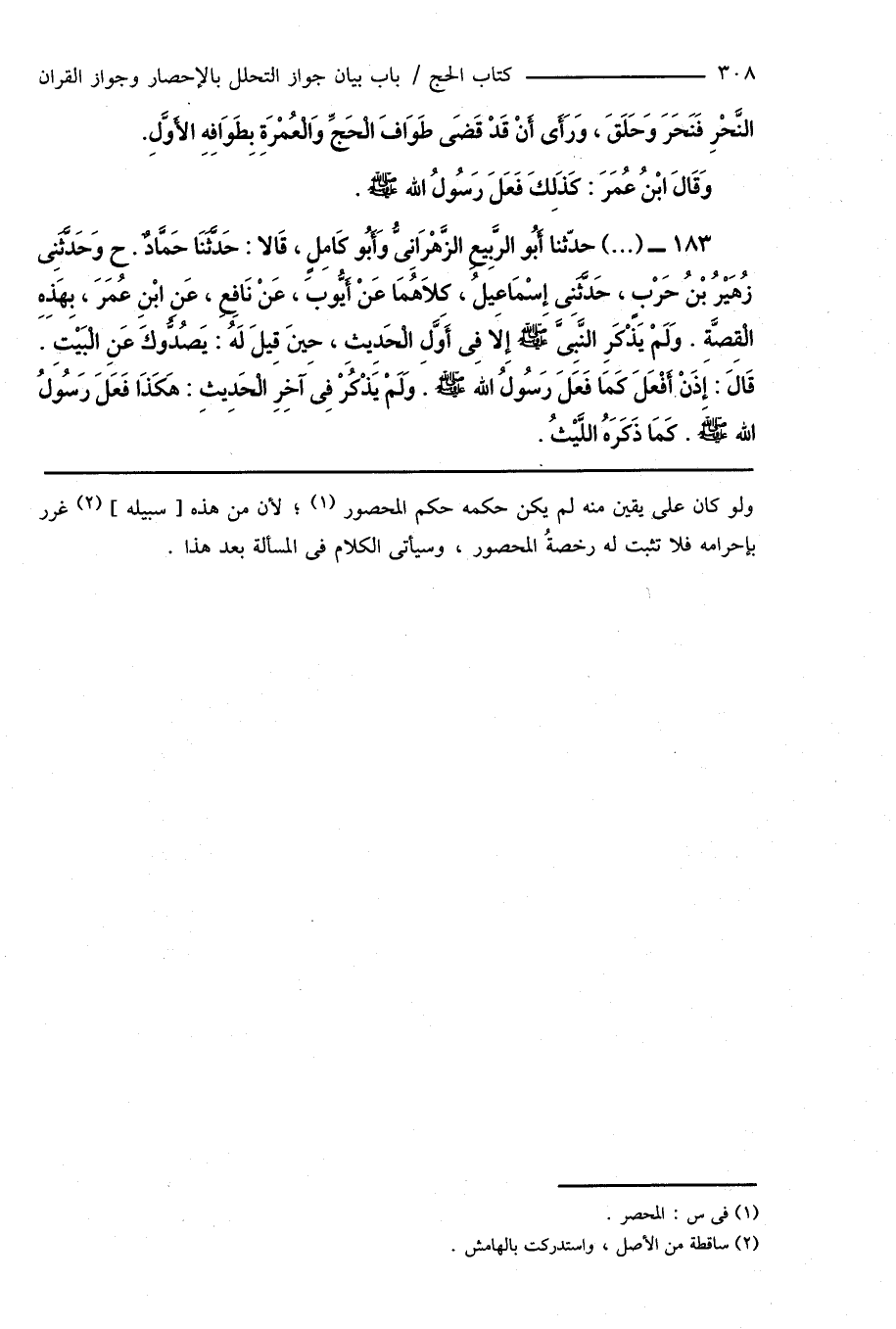 183 - (...) حدّثنا أَبُو الرَّبِيعِ الزَّهْرَانِىُّ وَأَبُو كَامِلٍ، قَالا: حَدَّثَنَا حَمَّادٌ. ح وَحَدَّثَنِى زُهَيْرُ بْنُ حَرْبٍ، حَدَّثَنِى إِسْمَاعِيلُ، كِلَاهُمَا عَنْ أَيُّوبَ، عَنْ نَافِعٍ، عَنِ ابْنِ عُمَرَ، بِهَذِهِ الْقِصَّةِ. وَلَمْ يَذْكَرِ النَّبِىَّ صَلَّى اللهُ عَلَيْهِ وَسَلَّمَ إِلا فِى أَوَّلِ الْحَدِيثِ، حِينَ قِيلَ لَهُ: يَصُدُّوكَ عَنِ الْبَيْتِ. قَالَ: إِذَنْ أَفْعَلَ كَمَا فَعَلَ رَسُولُ اللهِ صَلَّى اللهُ عَلَيْهِ وَسَلَّمَ. وَلَمْ يَذْكُرْ فِى آخِرِ الْحَدِيثِ: هَكَذَا فَعَلَ رَسُولُ اللهِ صَلَّى اللهُ عَلَيْهِ وَسَلَّمَ. كَمَا ذَكَرَهُ اللَّيْثُ.