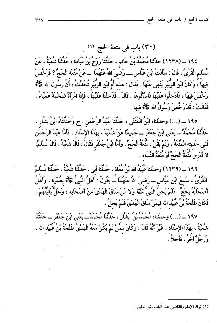 195 - (...) وحدّثناه ابْنُ الْمُثَنَّى، حَدَّثَنَا عَبْدُ الرَّحْمَنِ. ح وَحَدَّثَنَاهُ ابْنُ بَشَّارٍ، حَدَّثَنَا مُحَمَّدٌ - يَعْنِى ابْنَ جَعْفَرٍ - جَمِيعًا عَنْ شُعْبَةَ، بِهَذَا الإِسْنَادِ. فَأَمَّا عَبْدَ الرَّحْمَنِ فَفِى حَدِيثِهِ الْمُتْعَةُ، وَلَمْ يَقُلْ: مُتْعَةُ الْحَجِّ. وَأَمَّا ابْنُ جَعْفَرٍ فَقَالَ: قَالَ شُعْبَةُ: قَالَ مُسْلِمٌ - لا أَدْرِى مَتَعَةُ الْحَجِّ أَوْ مُتْعَةُ النِّسَاءِ.