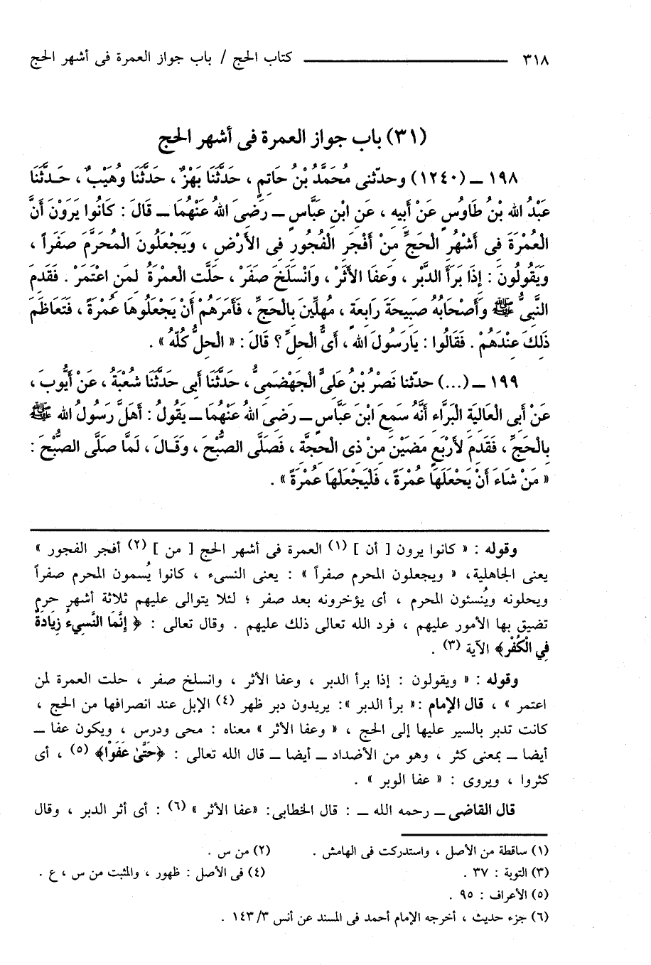 198 - (1240) وحدّثنى مُحَمَّدُ بْنُ حَاتِمٍ، حَدَّثَنَا بَهْزٌ، حَدَّثَنَا وُهَيْبٌ، حَدَّثَنَا عَبْدُ اللهِ بْنُ طَاوُسٍ عَنْ أَبِيهِ، عَنِ ابْنِ عَبَّاسٍ - رَضِىَ اللهُ عَنْهُمَا - قَالَ: كَانُوا يَرَوْنَ أَنَّ الْعُمْرَةَ فِى أَشْهُرِ الْحَجِّ مَنْ أَفْجَرِ الْفُجُورِ فِى الأَرْضِ، وَيَجْعَلُونَ الْمُحَرَّمَ صَفَراً، وَيَقُولُونَ: إِذَا بَرَأَ الدَّبْرِ، وَعفَا الأَثَرْ، وَانْسَلَخَ صَفَرْ، حَلَّتِ الْعُمْرَةُ لِمَنِ اعْتَمَرْ. فَقَدِمَ النَّبِىُّ صَلَّى اللهُ عَلَيْهِ وَسَلَّمَ وَأَصْحَابُهُ صَبِيحَةَ رَابِعَةٍ، مُهِلِّينَ بِالْحَجِّ، فَأَمَرَهُمْ أَنْ يَجْعَلُوهَا عُمْرَةً، فَتَعَاظَمَ ذَلِكَ عِنْدَهُمْ. فَقَالُوا: يَا رَسُولَ الله، أَىُّ الْحِلَّ؟ قَالَ: " الْحِلُّ كُلُّهُ ".