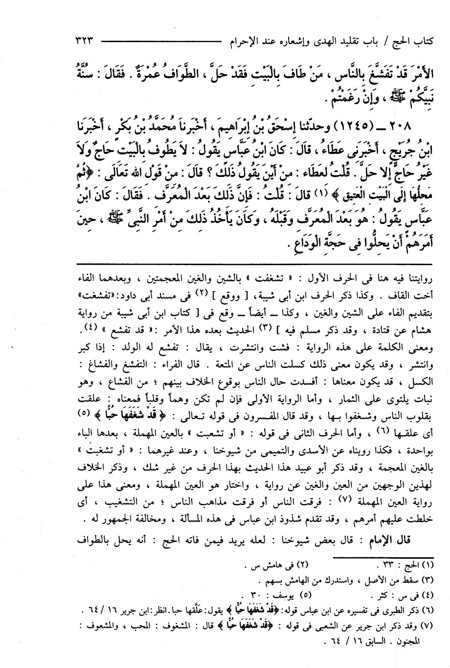 208 - (1245) وحدّثنا إِسْحَاقُ بْنُ إِبْرَاهِيمَ، أَخْبَرَنَا مُحَمَّدُ بْنُ بَكْرٍ، أَخْبَرَنَا ابْنُ جُرَيْجٍ، أَخْبَرَنِى عَطَاءُ، قَالَ: كَانَ ابْنُ عَبَّاسٍ يقُولُ: لَا يَطُوفُ بِالْبَيْتِ حَاجٌّ وَلَا غَيْرُ حَاجٍّ إِلا حَلَّ. قُلْتُ لِعَطَاءٍ: مِنْ أَيْنَ يَقُولُ ذَلِكَ؟ قَالَ: مِنْ قَوْلَ اللهِ تَعَالَى: {ثُمَّ مَحِلُّهَا إِلَى الْبَيْتِ الْعَتِيق} (¬1) قَالَ: قُلْتُ: فَإِنَّ ذَلِكَ بَعْدَ الْمُعَرَّفِ. فَقَالَ: كَانَ ابْنُ عَبَّاسٍ يَقُولُ: هُوَ بَعْدَ الْمُعَرَّفِ وَقَبْلَهُ، وَكَاَنَ يَأْخُذُ ذَلِكَ مِنْ أَمْرِ النَّبِىِّ صَلَّى اللهُ عَلَيْهِ وَسَلَّمَ، حِينَ أمَرَهُمْ أَنْ يَحِلُّوا فِى حَجَّةِ الْوَدَاعِ.