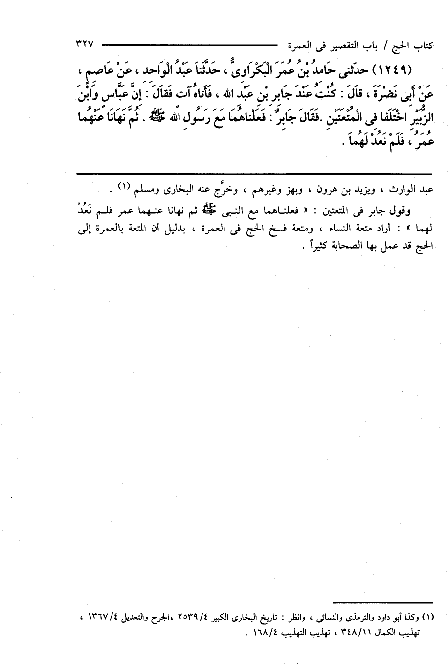 (1249) حدّثنى حَامِدُ بْنُ عُمَرَ الْبَكْرَاوِىُّ، حَدَّثَنَا عَبْدُ الْوَاحِدِ، عَنْ عَاصِمٍ، عَنْ أَبِى نَضْرَةَ، قَالَ: كُنْتُ عنْدَ جَابِرِ بْنِ عَبْدِ اللهِ، فَأَتَاهُ آتٍ فَقَالَ: إِنَّ ابْنَ عَبَّاسٍ وَابْنَ الزُّبَيْرِ اخْتَلَفا فِى الْمُتْعَتَيْنِ. فَقَالَ جَابِرٌ: فَعَلْنَاهُمَا مَعَ رَسُولِ الله صَلَّى اللهُ عَلَيْهِ وَسَلَّمَ. ثُمَّ نَهَانَا عَنْهُما عُمَرُ، فَلَمْ نَعُدْ لَهُمَا.
