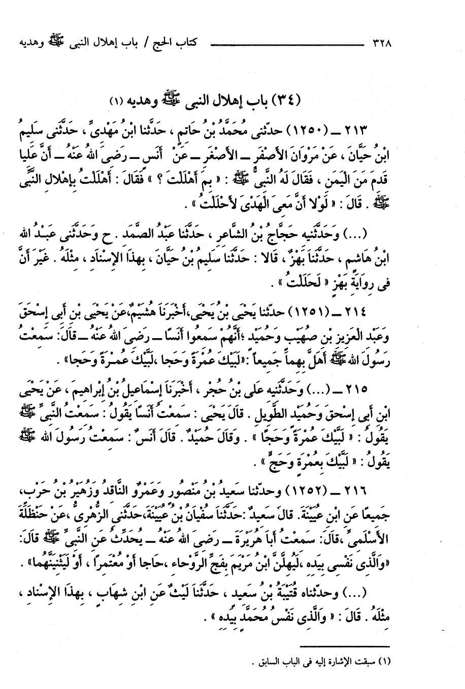 213 - (1250) حدَّثنى مُحَمَّدُ بْنُ حَاتِمٍ، حَدَّثنا ابْنُ مَهْدِىِّ، حَدَّثَنِى سَلِيمُ ابْنُ حَيَّانَ، عَنْ مَرْوَانَ الأَصْفَرِ - الأَصْغَرِ - عَنْ أَنَسٍ - رَضِىَ اللهُ عَنْهُ - أَنَّ عَلِيًّا قَدِمَ مَنَ الْيَمَنِ، فَقَالَ لَهُ النَّبِىُّ صَلَّى اللهُ عَلَيْهِ وَسَلَّمَ: " بِمَ أَهْلَلْتَ؟ " فقَالَ: أَهْلَلْتَ بِإِهْلالِ النَّبِىِّ صَلَّى اللهُ عَلَيْهِ وَسَلَّمَ. قَالَ: " لَوْلا أَنَّ مَعِىَ الْهَدْىَ لأَحْلَلْتُ ".