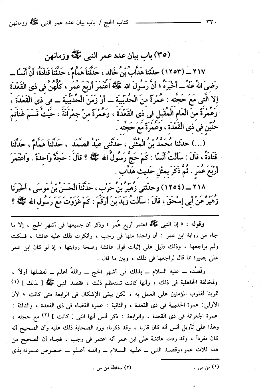 217 - (1253) حدَّثنا هَدَّابُ بْنُ خَالِدٍ، حَدَّثَنَا هَمَّامٌ، حَدَّثَنَا قَتَادَةُ؛ أَنَّ أَنَسًا - رَضِىَ اللهُ عَنْهُ - أَخْبَرَهُ؛ أَنَّ رَسُولَ اللهِ صَلَّى اللهُ عَلَيْهِ وَسَلَّمَ اعْتَمَرَ أَرْبَعَ عُمَرٍ، كُلُّهُنَّ فِى ذِى الْقَعْدَةِ إِلا الَّتِى مَعَ حَجَّتِهِ: عُمْرَةً مِنَ الْحُدَيْبِيَةِ - أَوْ زَمَنَ الْحُدَيْبِيَةِ - فِى ذِى الْقَعْدَةِ، وَعُمْرَةً مِنَ الْعَامِ الْمُقْبِلِ فِى ذِى الْقَعْدَةِ، وَعُمْرَةً مِنْ جِعْرَانَةَ، حَيْثُ قَسَمَ غَنَائِمَ حُنَيْنٍ فِى ذِى الْقَعْدَةِ، وَعمرَةً مَعَ حَجَّتِهِ.