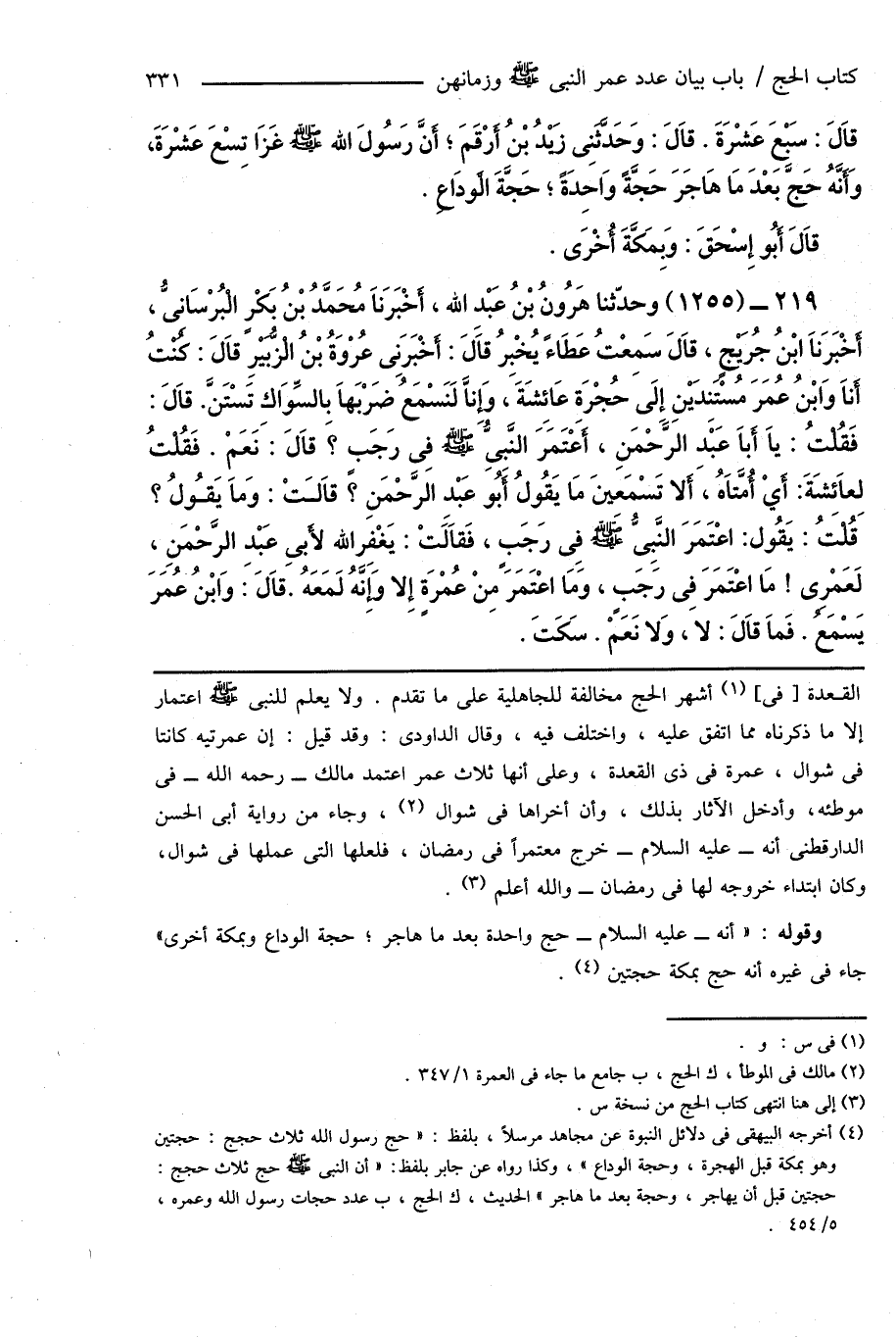 219 - (1255) وحدّثنا هَارُونُ بْنُ عَبْدِ اللهِ، أَخْبَرَنَا مُحَمَّدُ بْنُ بَكْرٍ الْبُرْسَانِىُّ، أَخْبَرَنَا ابْنُ جُرَيْجٍ، قَالَ سَمِعْتُ عَطَاءً يُخْبِرُ قَالَ: أَخْبَرَنِى عُرْوَةُ بْنُ الْزُّبَيْرِ قَالَ: كُنْتُ أَنَا وَابْنُ عُمَرَ مُسْتَنِدَيْنِ إِلَى حُجْرَةِ عَائِشَةَ، وَإِنَّا لَنَسْمَعُ ضَرْبَهَا بِالسَّوَاكِ تَسْتَنَّ. قَالَ: فَقُلْتُ: يَا أَبَا عَبْدِ الرَّحْمَنِ، أَعْتَمَرَ النَّبِىُّ صَلَّى اللهُ عَلَيْهِ وَسَلَّمَ فِى رَجَبٍ؟ قَالَ: نَعَمْ. فَقُلْتُ لِعَائِشَةَ: أَيْ أُمَّتَاهُ، أَلا تَسْمَعِينَ مَا يَقُولُ أَبُو عَبْدِ الرَّحْمَنِ؟ قَالَتْ: وَمَا يَقُولُ؟ قُلْتُ: يَقُول: اعْتَمَرَ النَّبِىُّ صَلَّى اللهُ عَلَيْهِ وَسَلَّمَ فِى رَجَبٍ، فَقَالَتْ: يَغْفِر الله لأَبِى عَبْدِ الرَّحْمَنِ، لَعَمْرِى! مَا اعْتَمَرَ فِى رَجَبٍ، وَمَا اعْتَمَرَ منْ عُمْرَةٍ إِلا وَإِنَّهُ لَمَعَهُ. قَالَ: وَابْنُ عُمَرَ يَسْمَعُ. فَمَا قَالَ: لا، وَلا نَعَمْ. سَكَتَ.