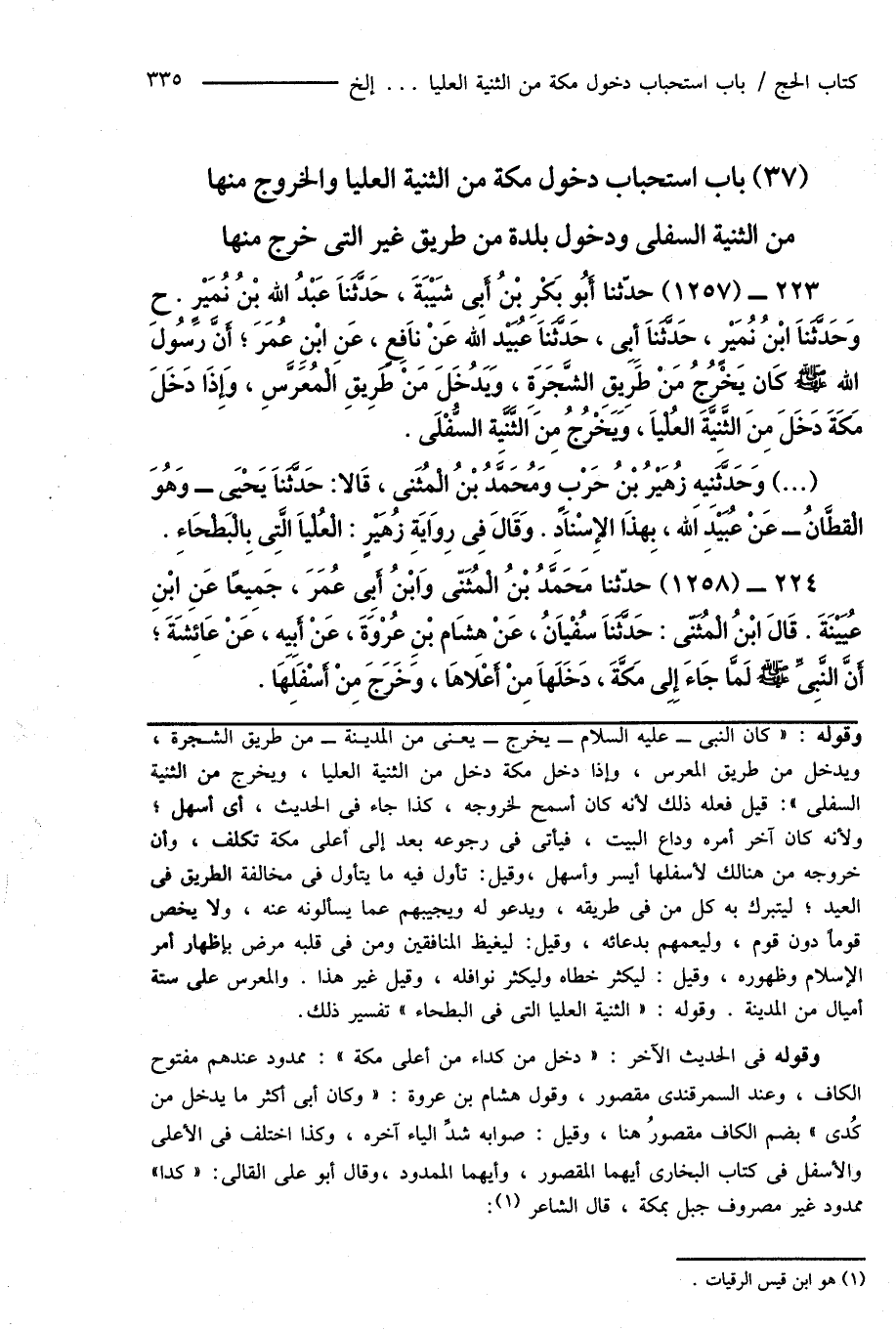 223 - (1257) حدَّثنا أَبُو بَكْر بْنُ أَبِى شَيْبَةَ، حَدَّثَنَا عَبْدُ اللهِ بْنُ نُمَيْرٍ. ح وَحَدَّثَنَا ابْنُ نُمَيْرٍ، حَدَّثَنَا أَبِى، حَدَّثَنَا عُبَيْدُ اللهِ عَنْ نَافِعٍ، عَنِ ابْنِ عُمَرَ؛ أَنَّ رَسُولَ اللهِ صَلَّى اللهُ عَلَيْهِ وَسَلَّمَ كَانَ يَخْرُجُ مَنْ طَرِيقِ الشَّجَرَةِ، وَيَدُخَلَ مَنْ طَرِيقِ الْمُعَرَّسِ، وَإِذَا دَخَلَ مَكَّةَ دَخَلَ مِنَ الثَّنِيَّة العُلْيَا، وَيَخْرُجُ مِنَ الثَّنِيَّة السُّفْلَى.