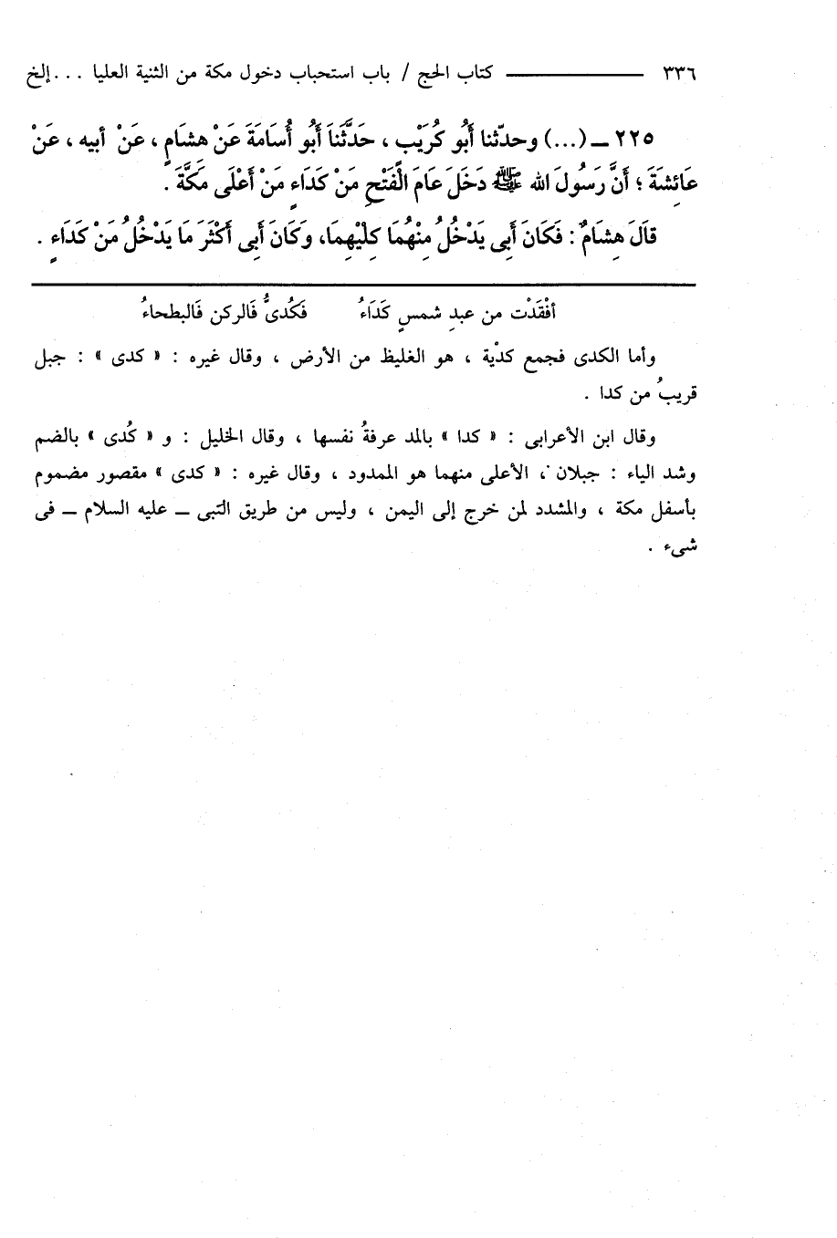 225 - (...) وحدّثنا أَبُو كُرَيْبٍ، حَدَّثَنَا أَبُو أُسَامَةَ عَنْ هِشَامٍ، عَنْ أَبِيهِ، عَنْ عَائِشَةَ؛ أَنَّ رَسُولَ اللهِ صَلَّى اللهُ عَلَيْهِ وَسَلَّمَ دَخَلَ عَامَ الْفَتْحِ مَنْ كَدَاءٍ مَنْ أَعْلَى مَكَّةَ. قَالَ هِشَامٌ: فَكَانَ أَبِى يَدْخُلُ مِنْهُمَا كِليْهِمَا، وَكَانَ أَبِى أَكْثَرَ مَا يَدْخُلُ مَنْ كَدَاءٍ.