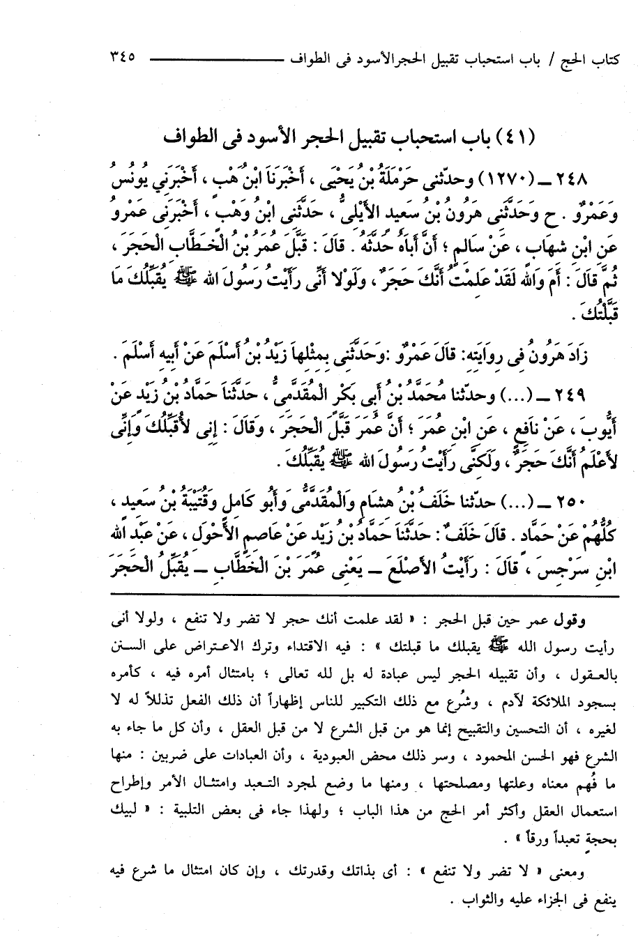 248 - (1270) وحدّثنى حَرْمَلَةُ بْنُ يَحْيَى، أَخْبَرَنَا ابْنُ وَهْبٍ، أَخْبَرَنِى يُونُسُ وَعَمْرٌو. ح وَحَدَّثَنِى هَارُونُ بْنُ سَعِيدٍ الأَيْلِىُّ، حَدَّثَنِى ابْنُ وَهْبٍ، أَخْبَرَنِى عَمْرُو عَنِ ابْنِ شِهَابٍ، عَنْ سَالِمٍ؛ أَنَّ أَبَاهُ حَدَّثَهُ. قَالَ: قَبَّلَ عُمَرُ بْنُ الْخَطَّابِ الْحَجَرَ، ثُمَّ قَالَ: أَمَ وَاللهِ لَقَدْ عَلِمْتُ أَنَّكَ حَجَرٌ، وَلَوْلا أَنِّى رَأَيْتُ رَسُولَ اللهِ صَلَّى اللهُ عَلَيْهِ وَسَلَّمَ يُقَبِّلُكَ مَا قَبَّلْتُكَ.