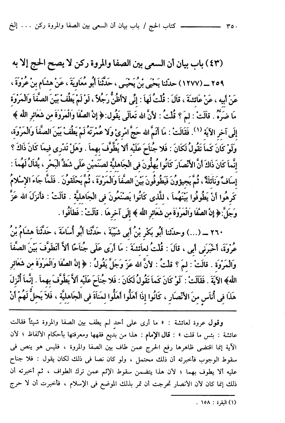 260 - (...) وحدّثنا أَبُو بَكْرِ بْنُ أَبِى شَيْبَةَ، حَدَّثَنَا أَبُو أُسَامَةَ، حَدَّثَنَا هِشَامُ بْنُ عُرْوَةَ، أَخْبَرَنِى أَبِى، قَالَ: قُلْتُ لِعَائِشَةَ: مَا أَرَى عَلَى جُنَاحًا أَلَّا أَتَطَوَّفَ بَيْنَ الصَّفَا وَالْمَرْوَةِ. قالَتْ: لِمَ؟ قلتُ: لأَنَّ الله عَزَّ وَجَلَّ يَقُولُ: {إِنَّ الصَّفَا وَالْمَرْوَةَ مِن شَعَائِرِ اللَّه} الآيَةَ. فَقَالَتْ: لَوْ كَانَ كَمَا تَقُولُ لَكَانَ: فَلا جُنَاحَ عَلَيْهِ أَلَّا يَطَّوَّفَ بِهِمَا. إِنَّمَا أُنْزِلَ هَذَا فِى أُنَاسٍ مِنَ الأَنْصَارِ، كَانُوا إِذَا أَهَلُّوا أَهَلُّوا لِمَنَاةَ فِى الْجَاهِلِيَّةِ، فَلَا يَحِلُّ لَهُمْ أَنْ