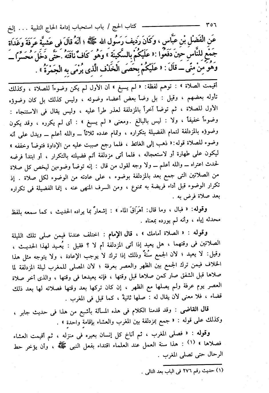 قال القاضى: وقد قدمنا الكلام فى هذه المسألة بأشبع من هذا فى حديث جابر، وكذلك على قوله: " جمع بمزدلفة بين المغرب والعشاء بإقامةٍ واحدةٍ ".