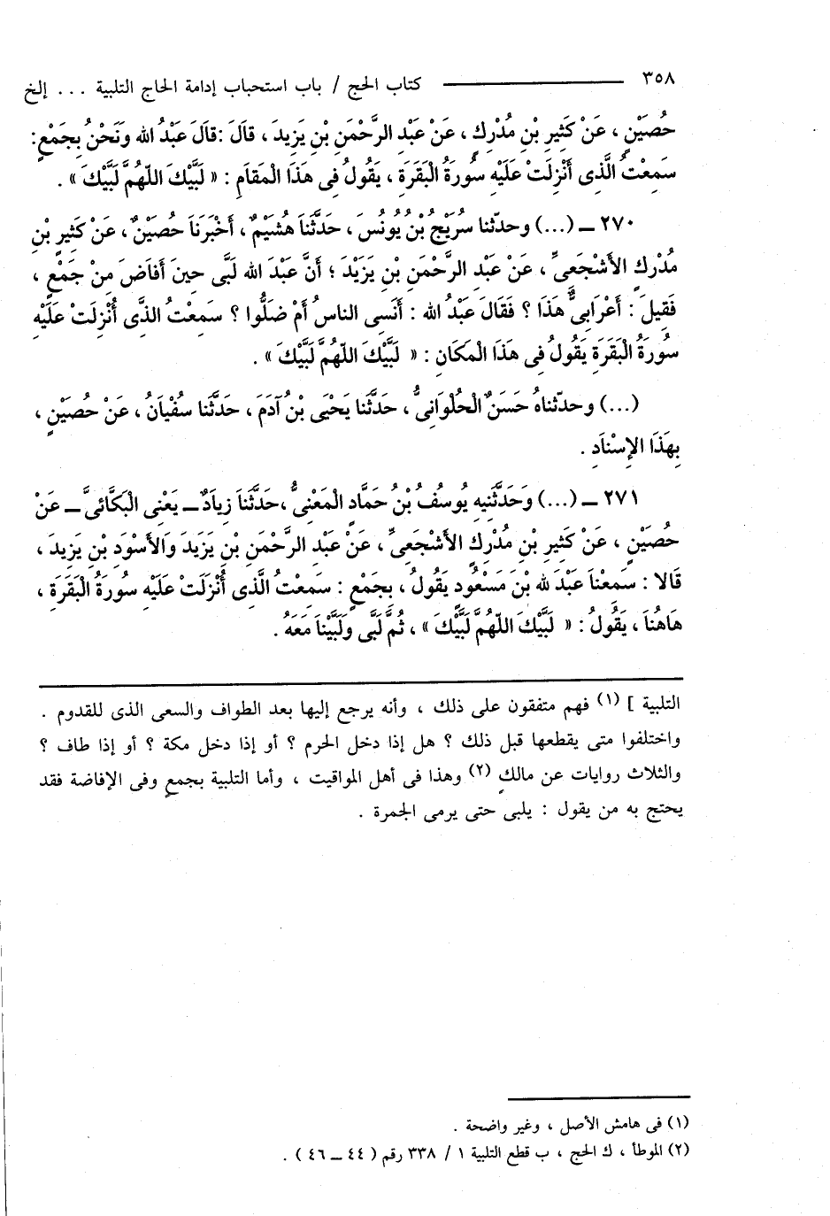 270 - (...) وحدّثنا سُرَيْجُ بْنُ يُونُسَ، حَدَّثَنَا هُشَيْمٌ، أَخْبَرَنَا حُصَيْنٍ، عَنْ كَثِيرٍ بْنِ مُدْرِكٍ الأَشْجَعِىِّ، عَنْ عَبْدِ الرَّحْمَنِ بْنِ يَزِيْدَ؛ أَنَّ عَبْدَ اللهِ لَبَّى حِينَ أَفَاضَ مِنْ جَمْعٍ، فَقِيلَ: أَعْرَابِىٌّ هَذَا؟ فَقَالَ عَبْدُ اللهِ: أَنَسِى النَّاسُ أَمْ ضَلُّوا؟ سَمِعْتُ الَّذِى أُنْزِلَتْ عَلَيْهِ سُورَةُ الْبَقَرَةِ يَقُولُ فِى هَذَا الْمَكَانِ: " لَبَّيْكَ اللَّهُمَّ لَبَّيْكَ ".