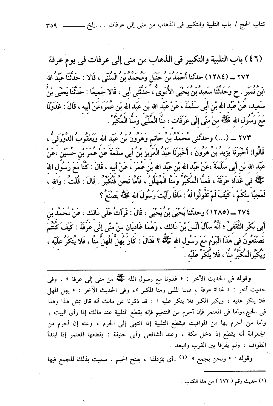 272 - (1284) حدَّثنا أَحْمَدُ بْنُ حَنْبَلٍ وَمُحَمَّدُ بْنُ الْمُثَنَّى، قَالا: حَدَّثَنَا عَبْدُ اللهِ ابْنُ نُمَيْرٍ. ح وَحَدَّثَنَا سَعِيدُ بْنُ يَحْيَى الأُمَوِىُّ، حَدَّثَنِى أَبِى، قَالا جَمِيعًا: حَدَّثَنَا يَحْيَى بْنُ سَعِيدٍ، عَنْ عَبْدِ اللهِ بْنِ أَبِى سَلَمَةَ، عَنْ عَبْدِ اللهِ بْنِ عَبْدِ اللهِ بْنِ عُمَرَ، عَنْ أَبِيهِ، قَالَ: غَدَوْنَا مَعَ رَسُولِ اللهِ صَلَّى اللهُ عَلَيْهِ وَسَلَّمَ مِنْ مِنًى إِلَى عَرَفَاتٍ، مِنَّا الْمُلَبِّى وَمِنَّا الْمُكَبِّرُ.