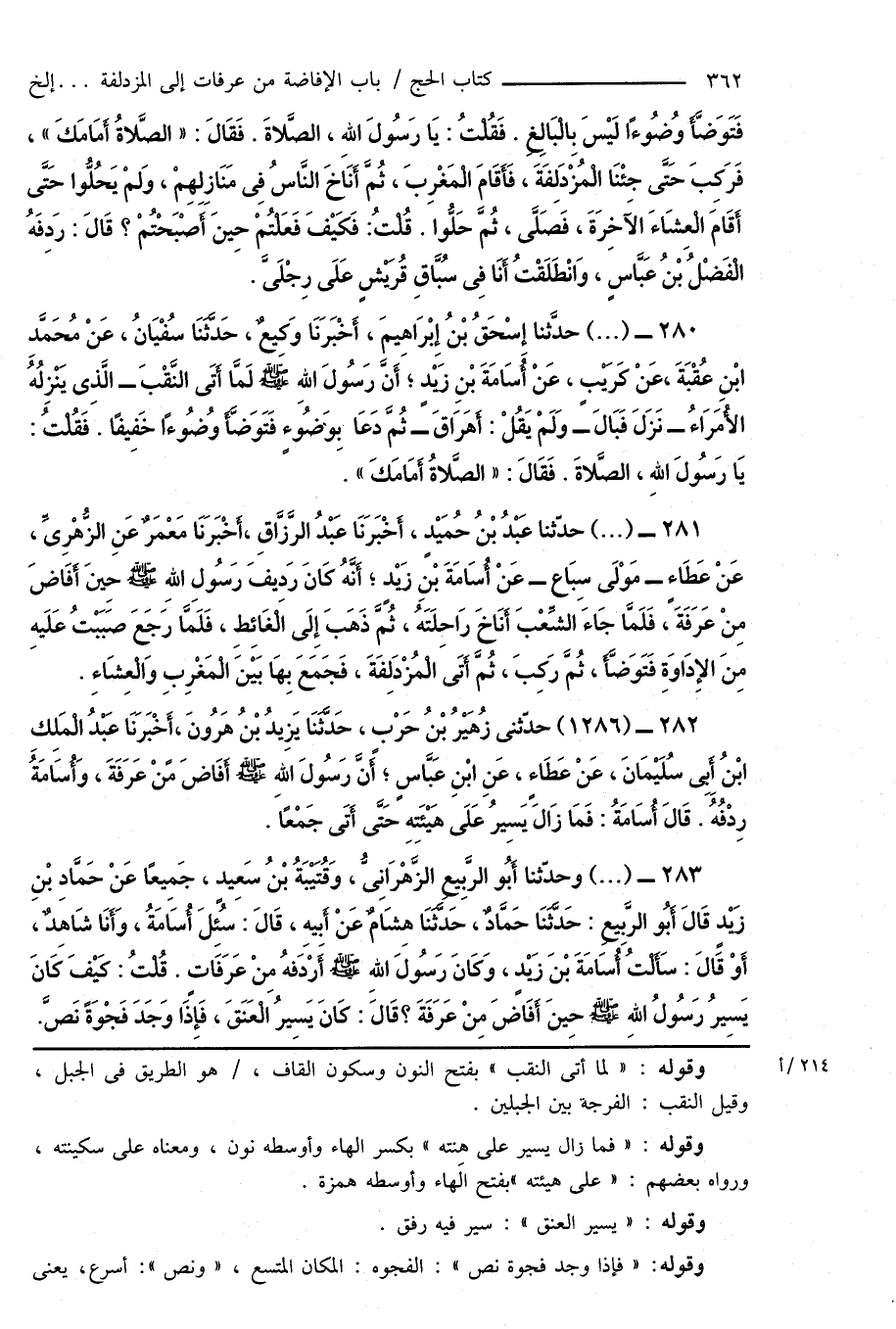 283 - (...) وحدّثنا أَبُو الرَّبِيعِ الزَّهْرَانِىُّ، وَقُتَيْبَةُ بْنُ سَعِيدٍ، جَمِيعًا عَنْ حَمَّادِ بْنِ زَيْدٍ قَالَ أَبُو الرَّبِيعِ: حَدَّثَنَا حَمَّادٌ، حَدَّثَنَا هِشَامٌ عَنْ أَبِيهِ، قَالَ: سُئِلَ أُسَامَةُ، وَأَنَا شَاهِدٌ، أَوْ قَالَ: سَأَلْتُ أُسَامَةَ بْنَ زَيْدٍ، وَكَانَ رَسُولَ اللهِ صَلَّى اللهُ عَلَيْهِ وَسَلَّمَ أَرْدَفَهُ مِنْ عَرَفَاتٍ. قُلْتُ: كَيْفَ كَانَ يَسِيرُ رَسُولُ اللهِ صَلَّى اللهُ عَلَيْهِ وَسَلَّمَ حِينَ أَفَاضَ مِنْ عَرَفَةَ؟ قَالَ: كَانَ يَسِيرُ الْعَنَقَ، فَإِذَا وَجَدَ فَجْوَةً نَصَّ.