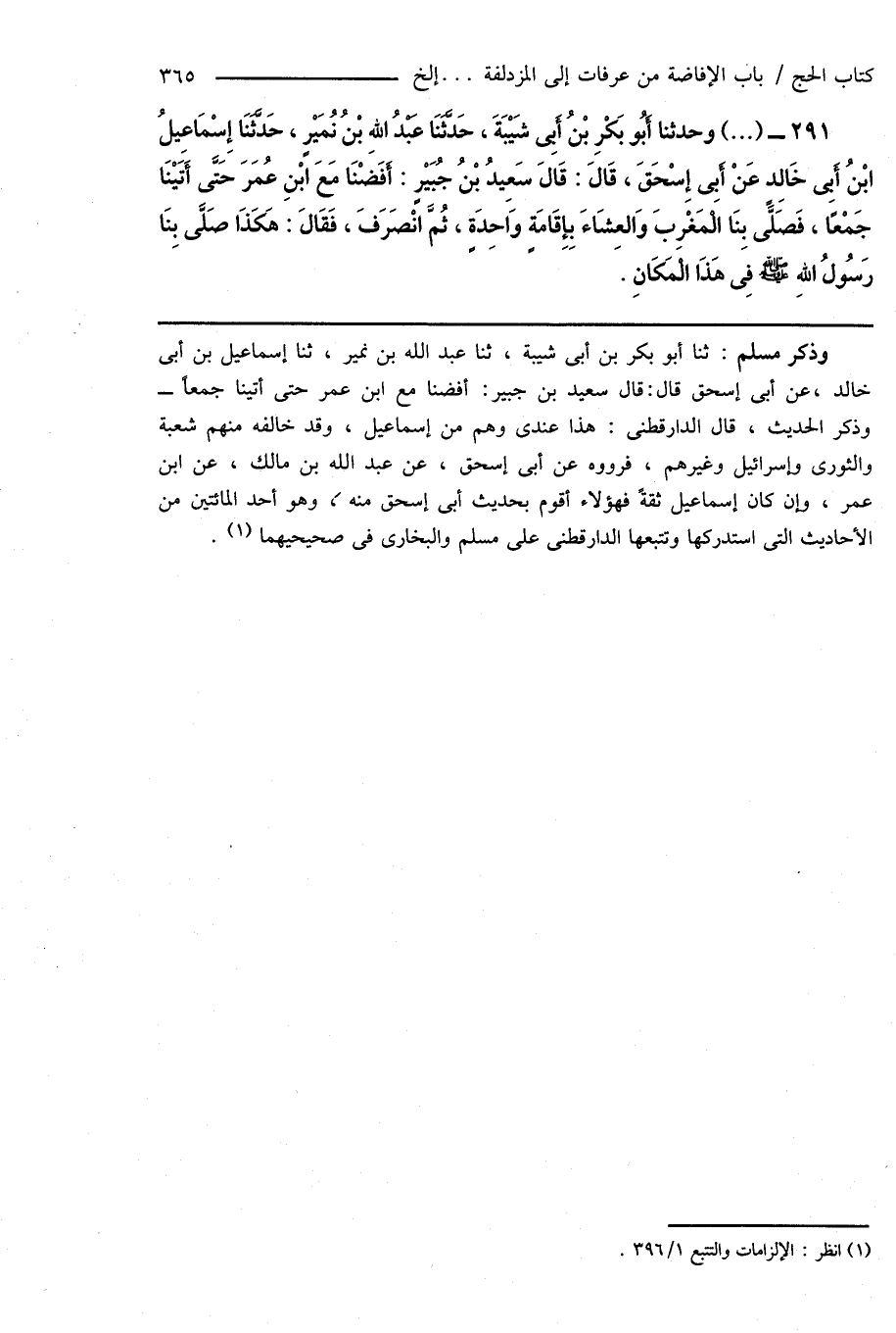 291 - (...) وحدّثنا أَبُو بَكْرِ بْنُ أَبِى شَيْبَةَ، حَدَّثَنَا عَبْدُ اللهِ بْنُ نُمَيْرٍ، حَدَّثَنَا إِسْمَاعِيلُ ابْنُ أَبِى خَالِدٍ عَنْ أَبِى إِسْحَاقَ، قَالَ: قَالَ سَعِيدُ بْنُ جُبَيْرٍ: أَفَضْنَا مَعَ ابْنِ عُمَرَ حَتَّى أَتَيْنَا جَمْعًا، فَصَلَّى بِنَا الْمَغْرِبَ وَالعِشَاءَ بِإِقَامَةٍ وَاحِدَةٍ، ثُمَّ انْصَرَفَ، فَقَالَ: هَكَذَا صَلَّى بِنَا رَسُولُ اللهِ صَلَّى اللهُ عَلَيْهِ وَسَلَّمَ فِى هَذَا الْمَكَانِ.