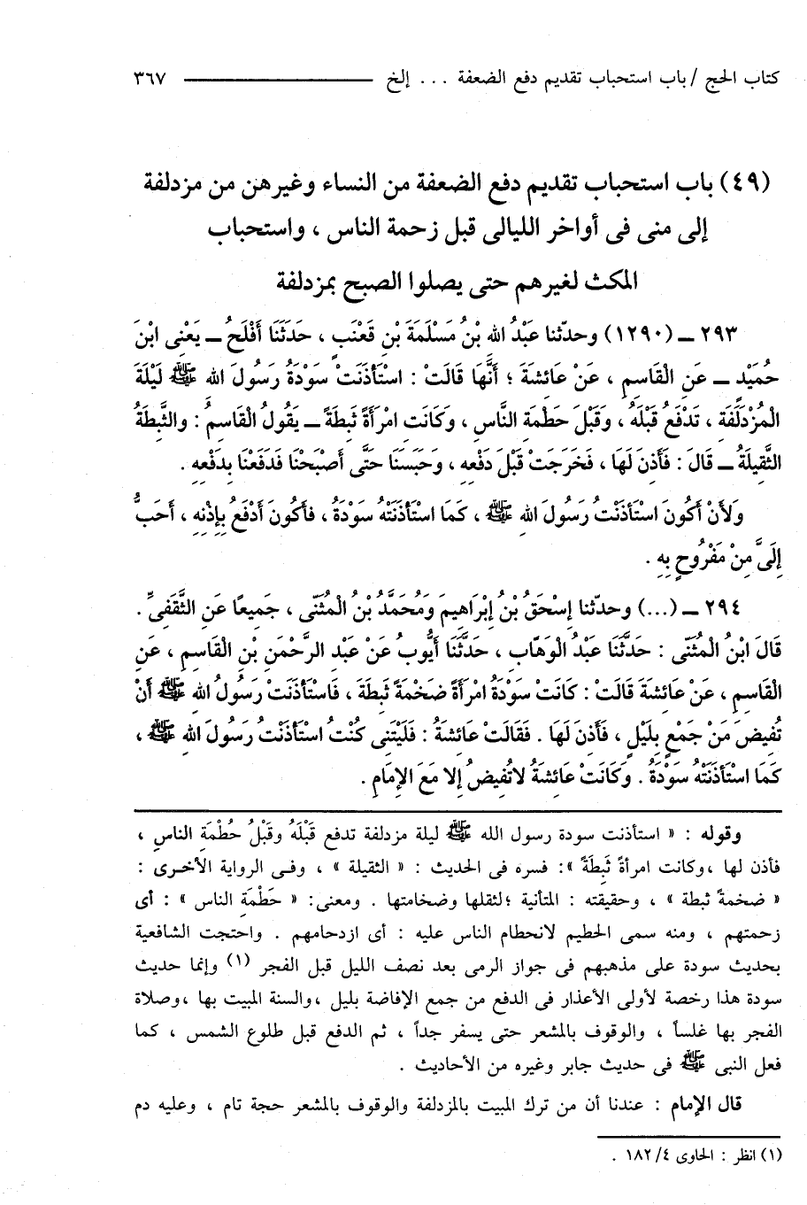 293 - (1290) وحدّثنا عَبْدُ اللهِ بْنُ مَسْلَمَةَ بْنِ قَعْنَبٍ، حَدَّثَنَا أَفْلَحُ - يَعْنِى ابْنَ حُمَيْدٍ - عَنِ الْقَاسِمِ، عَنْ عَائِشَةَ؛ أَنَّهَا قَالَتْ: اسْتَأْذَنَتْ سَوْدَةُ رَسُولَ اللهِ صَلَّى اللهُ عَلَيْهِ وَسَلَّمَ لَيْلَةَ الْمُزْدَلِفَةِ، تَدْفَعُ قَبْلَهُ، وَقَبْلَ حَطْمَةِ النَّاسِ، وَكَانَتِ امْرَأَةً ثَبِطَةً - يَقُولُ الْقَاسِمُ: والثَّبِطَةُ الثَّقِيلَةُ - قَالَ: فَأَذِنَ لَهَا، فَخَرَجَتْ قَبْلَ دَفْعِهِ، وَحَبَسنَا حَتَّى أَصْبَحْنَا فَدَفَعْنَا بِدَفْعِهِ. وَلأَنْ أَكُونَ اسْتَأْذَنْتُ رَسُولَ اللهِ صَلَّى اللهُ عَلَيْهِ وَسَلَّمَ، كَمَا اسْتَأْذَنَتْهُ سَوْدَةُ، فَأَكُونَ أَدْفَعُ بِإِذْنِهِ، أَحَبُّ إِلَىَّ مِنْ مَفْرُوحٍ بِهِ.