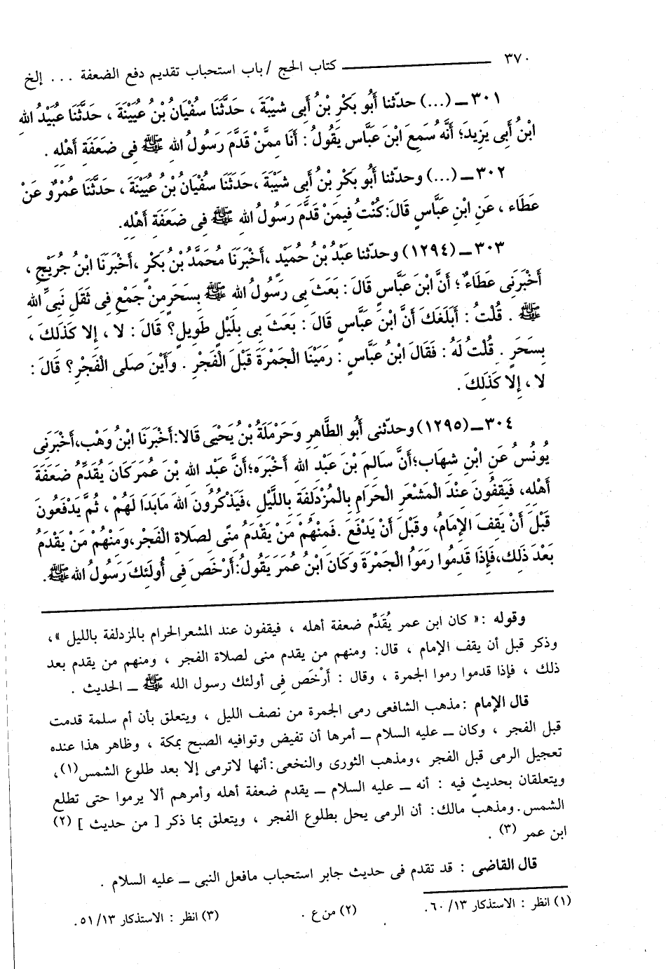 302 - (...) وحدّثنا أَبُو بَكْرِ بْنُ أَبِى شَيْبَةَ، حَدَّثَنَا سُفْيَانُ بْنُ عُيَيْنَةَ، حَدَّثَنَا عُمْرٌو عَنْ عَطَاء، عَنِ ابْنِ عَبَّاسٍ قَالَ: كُنْتُ فِيمَنْ قَدَّمَ رَسُولُ اللهِ صَلَّى اللهُ عَلَيْهِ وَسَلَّمَ فِى ضَعَفَةِ أَهْلِهِ.