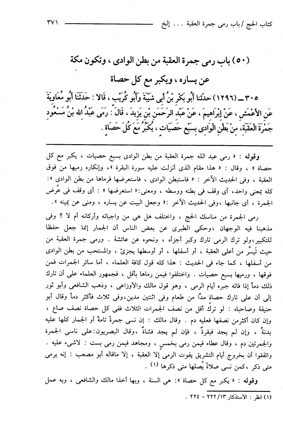 305 - (1296) حدّثنا أَبُو بَكْرِ بْنُ أَبِى شَيْبَةَ وَأَبُو كُرَيْبٍ، قَالا: حَدَّثَنَا أَبُو مُعَاوِيَةَ عَنِ الأَعْمَشِ، عَنْ إِبْرَاهِيمَ، عَنْ عَبْدِ الرَّحْمَنِ بْنِ يَزِيدَ، قَالَ: رَمَى عَبْدُ اللهِ بْنُ مَسْعُودِ جَمْرَةَ الْعَقَبَةِ، مِنْ بَطْنِ الْوَادِى بِسَبْعِ حَصَيَاتٍ، يُكَبِّرُ مَعَ كُلِّ حَصَاةٍ.