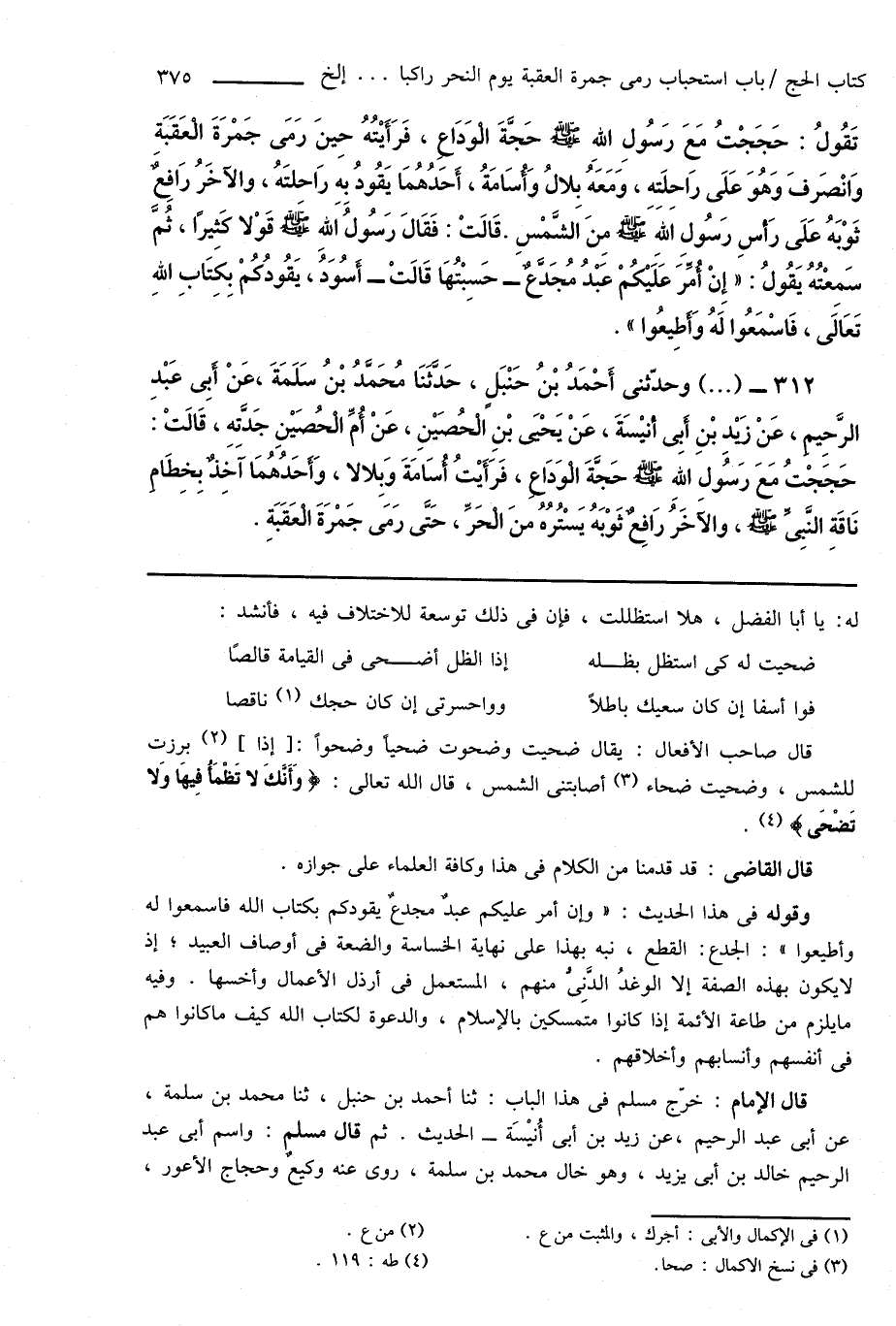312 - (...) وحدّثنى أَحْمَدُ بْنُ حَنْبَلٍ، حَدَّثَنَا مُحَمَّدُ بْنُ سَلَمَةَ، عَنْ أَبِى عَبْدِ الرَّحِيمِ، عَنْ زَيْدِ بْنِ أَبِى أُنيْسَةَ، عَنْ يَحْيَى بْنِ الْحُصَيْنِ، عَنْ أُمِّ الْحُصَيْنِ جَدَّتِهِ، قَالَتْ: حَجَجْتُ مَعَ رَسُولِ اللهِ صَلَّى اللهُ عَلَيْهِ وَسَلَّمَ حَجَّةَ الْوَدَاعِ، فَرَأَيْتُ أُسَامَةَ وَبِلالاً، وَأَحَدُهُمَا آخِذٌ بِخِطَامِ نَاقَةِ النَّبِىِّ صَلَّى اللهُ عَلَيْهِ وَسَلَّمَ، والآخَرُ رَافِعٌ ثَوْبَهُ يَسْتُرُهُ مِنَ الْحَرِّ، حَتَّى رَمَى جَمْرَةَ الْعَقَبَةِ.