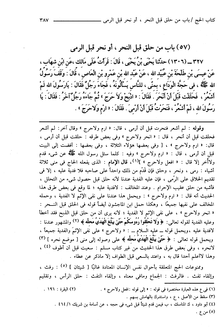 327 - (1306) حدَّثنا يَحْيَى بْنُ يَحْيَى، قَالَ: قَرَأْتُ عَلَى مَالِكٍ، عَنِ ابْنِ شِهَابٍ، عَنْ عِيسَى بْنِ طَلْحَةَ بْنِ عُبَيْدِ اللهِ، عَنْ عَبْدِ اللهِ بْنِ عَمْرِو بْنِ الْعَاصِ، قَالَ: وَقَفَ رَسُولُ اللهِ صَلَّى اللهُ عَلَيْهِ وَسَلَّمَ، فِى حَجَّةِ الْوَدَاعِ، بِمِنًى، لِلْنَّاسِ يَسْأَلُونَهُ، فَجَاءَ رَجُلٌ فَقَالَ: يَا رَسُولَ اللهِ لَمْ أَشْعُرْ، فَحَلَقْت قَبْلَ أَنْ أَنْحَرَ. فَقَالَ: " اذْبَحْ وَلَا حَرَجَ " ثُمَّ جَاءَهُ رَجُلٌ آخَرُ: فَقَالَ: يَا رَسُولَ اللهِ، لَمْ أَشْعُرْ، فَنَحَرْتُ قَبْلَ أَنْ أَرْمِىَ. فَقَالَ: " ارْمِ وَلا حَرَجَ ".