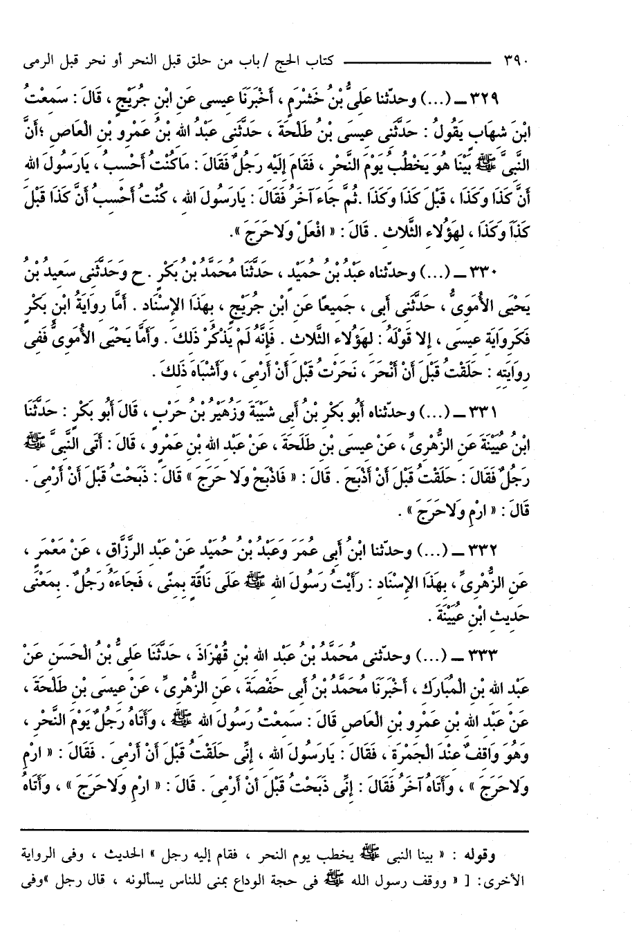 331 - (...) وحدّثثاه أَبُو بَكْرِ بْنُ أَبِى شَيْبَةَ وَزُهَيْرُ بْنُ حَرْبٍ، قَالَ أَبُو بَكْرٍ: حَدَّثَنَا ابْنُ عُيَيْنَةَ عَنِ الزُّهْرِىِّ، عَنْ عِيسَى بْنِ طَلْحَةَ، عَنْ عَبْدِ اللهِ بْنِ عَمْرٍو، قَالَ: أَتَى النَّبِىَّ صَلَّى اللهُ عَلَيْهِ وَسَلَّمَ رَجُلٌ فَقَالَ: حَلَقْتُ قَبْلَ أَنْ أَذَبَحَ. قَالَ: " فَاذْبَحْ وَلا حَرَجَ " قَالَ: ذَبَحْتُ قَبْلَ أَنْ أَرْمِىَ. قَالَ: " ارْمِ وَلا حَرَجَ ".