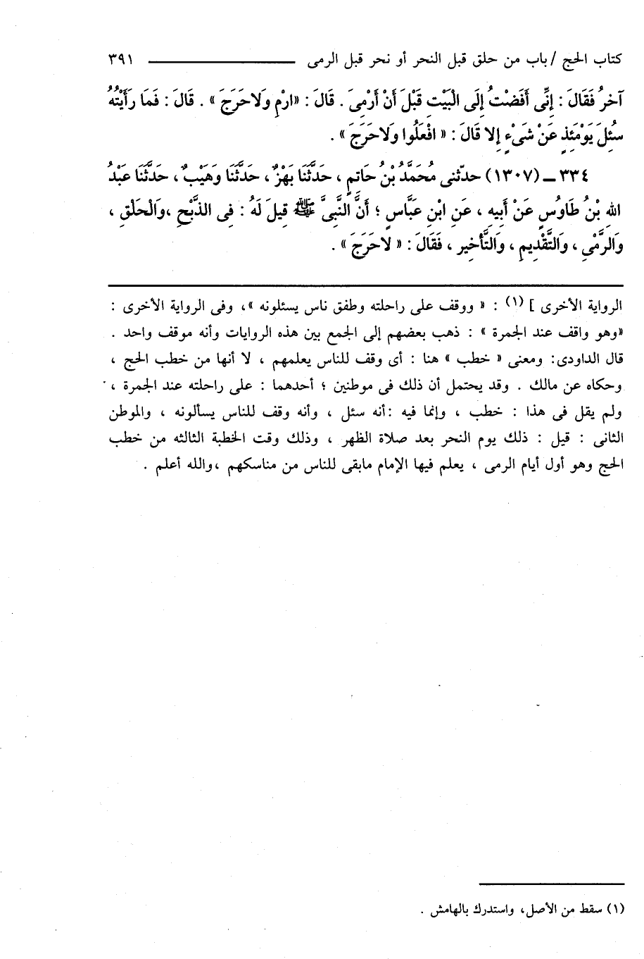 334 - (1307) حدّثنى مُحَمَّدُ بْنُ حَاتِمٍ، حَدَّثَنَا بَهْزٌ، حَدَّثَنَا وهَيْبٌ، حَدَّثَنَا عَبْدُ اللهِ بْنُ طَاوُسٍ عَنْ أَبِيهِ، عَنِ ابْنِ عَبَّاسٍ؛ أَنَّ النَّبِىَّ صَلَّى اللهُ عَلَيْهِ وَسَلَّمَ قِيلَ لَهُ: فِى الذَّبْحِ، وَالْحَلْقِ، وَالرَّمْىِ، وَالتَّقْدِيمِ، وَالتَّأْخِير، فَقَالَ: " لا حَرَجَ ".