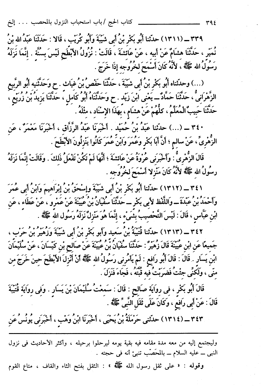 342 - (1313) حدَّثنا قُتَيْبَةُ بْنُ سَعِيدٍ وَأَبُو بَكْرِ بْن أَبِى شَيْبَةَ وَزُهَيْرُ بْنُ حَرْبٍ، جَمِيعًا عَنِ ابْنِ عُيَيْنَةَ قَالَ زُهَيْرٌ: حَدَّثَنَا سُفْيَانُ بْنُ عُيَيْنَةَ عَنْ صَالِحِ بْنِ كَيْسَانَ، عَنْ سُلَيْمَانَ ابْنِ يَسَارٍ. قَالَ: قَالَ أَبُو رَافِعٍ: لَمْ يَأمُرِنِى رَسُولُ اللهِ صَلَّى اللهُ عَلَيْهِ وَسَلَّمَ أَنْ أَنْزِلَ الأَبْطَحَ حِينَ خَرَجَ مِن مِنى، وَلَكِنِّى جِئْتُ فَضَرَبْتُ فِيهِ قُبَّتَهُ، فَجَاءَ فَنَزَلَ.