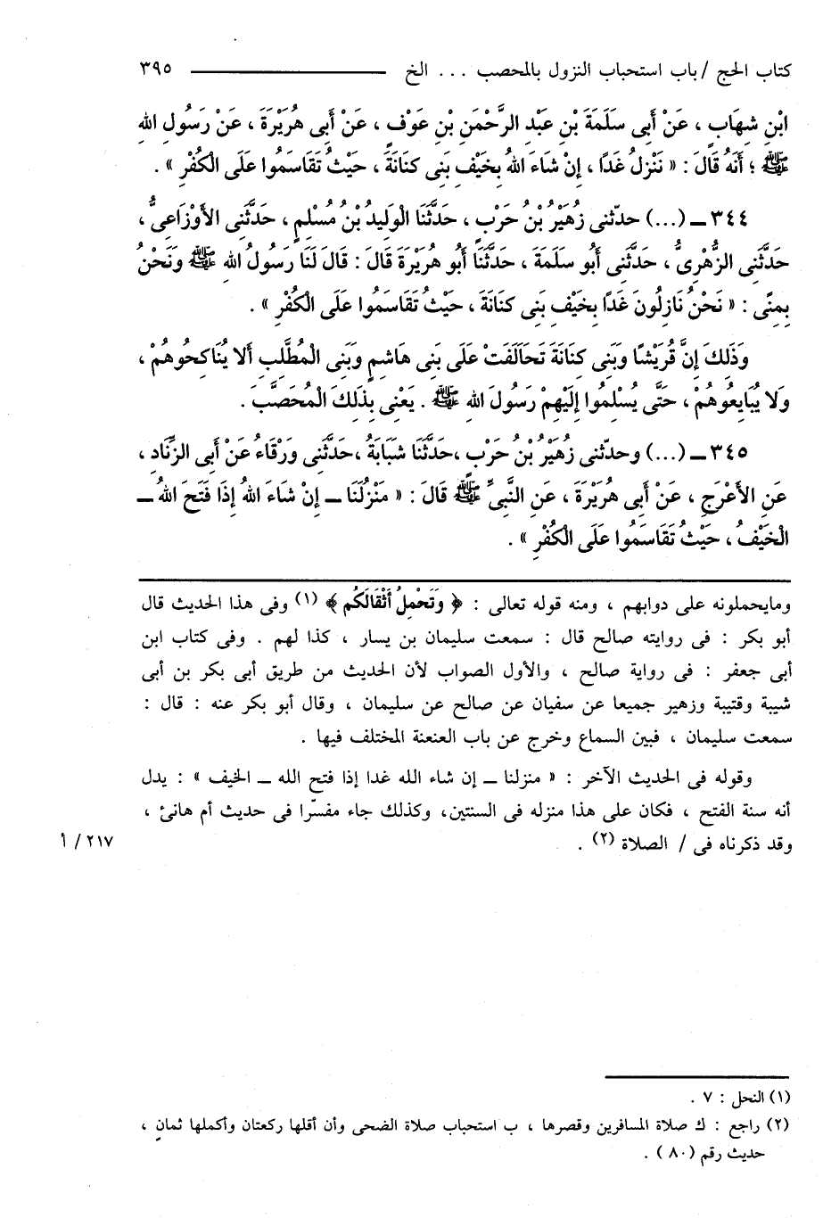 344 - (...) حدّثنى زُهَيْرُ بْنُ حَرْبٍ، حَدَّثَنَا الْوَلِيدُ بْنُ مُسْلِمٍ، حَدَّثَنِى الأَوْزَاعِىُّ، حَدَّثَنِى الزُّهْرِىُّ، حَدَّثَنِى أَبُو سَلَمَةَ، حَدَّثَنَا أَبُو هُرَيْرَةَ قَالَ: قَالَ لَنَا رَسُولُ اللهِ صَلَّى اللهُ عَلَيْهِ وَسَلَّمَ وَنَحْنُ بِمِنًى: " نَحْنُ نَازِلُونَ غَدًا بِخَيْفِ بَنِى كنَانَةَ، حَيْثُ تَقَاسَمُوا عَلَى الْكُفْرِ ".