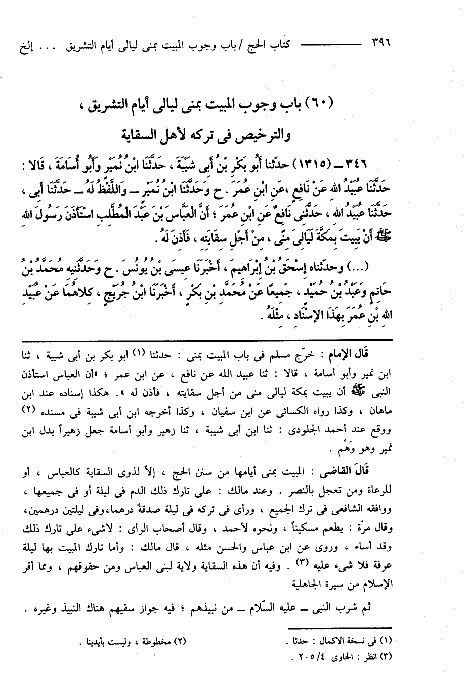346 - (1315) حدّثنا أَبُو بَكْر بْنُ أبى شَيْبَةَ، حَدَّثَنَا ابْنُ نُمَيْرٍ وَأَبُو أُسَامَةَ، قَالا: حَدَّثَنَا عُبَيْدُ اللهِ عَنْ نَافِعٍ، عَنِ ابْنِ عُمَرَ. ح وَحَدَّثَنَا ابْنُ نُمَيْرٍ - وَاللَّفْظُ لَهُ - حَدَّثَنَا أَبِى، حَدَّثَنَا عُبَيْدُ اللهِ، حَدَّثَنِى نَافِعٌ عَنِ ابْنِ عُمَرَ؛ أَنَّ الْعَبَّاسَ بْنَ عَبْدَ الْمُطَّلِبِ اسْتَأْذَنَ رَسُولَ اللهِ صَلَّى اللهُ عَلَيْهِ وَسَلَّمَ أَنْ يَبِيتَ بِمَكَّةَ لَيَالِىَ مِنًى، مِنْ أَجْلِ سِقَايَتِهِ، فَأَذِنَ لَهُ.
