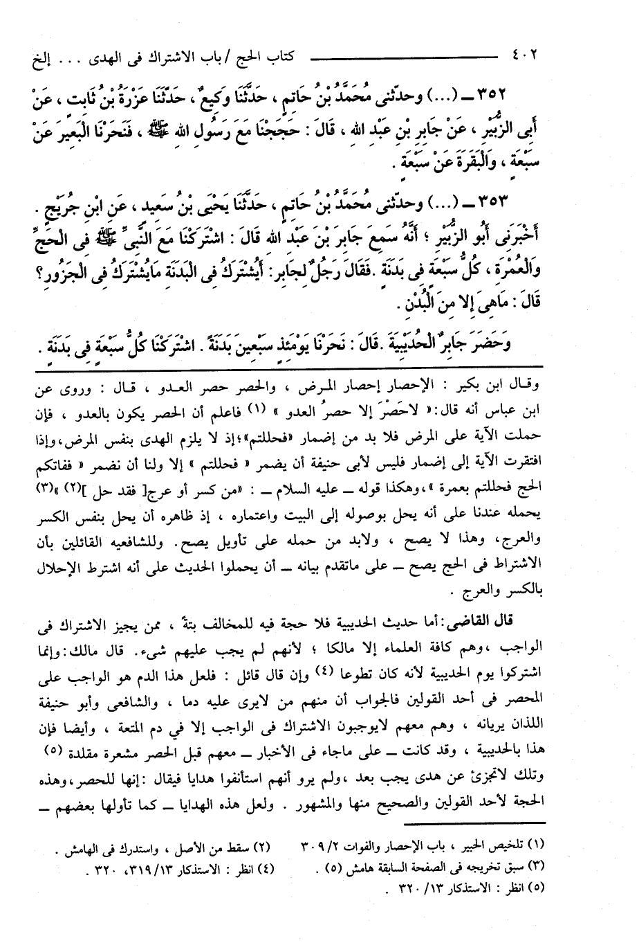 353 - (...) وحدّثنى مُحَمَّدُ بْنُ حَاتِمٍ، حَدَّثَنَا يَحْيَى بْنُ سَعِيدٍ، عَنِ ابْنِ جُرَيْجٍ. أَخْبَرَنِى أَبُو الزُّبَيْرِ؛ أَنَّهُ سَمِعَ جَابِرَ بْنَ عَبْدِ اللهِ قَالَ: اشْتَرَكْنَا مَعَ النَّبِىِّ صَلَّى اللهُ عَلَيْهِ وَسَلَّمَ فِى الحَجِّ وَالْعُمْرَةِ، كُلُّ سَبْعَةٍ فِى بَدَنَةٍ. فَقَالَ رَجُلٌ لِجَابِر: أَيُشْتَرَكُ فِى الْبَدَنَةِ مَا يُشْتَرَكُ فِى الْجَزُورِ؟ قَالَ: مَا هِىَ إِلا مِنَ الْبُدْنِ.