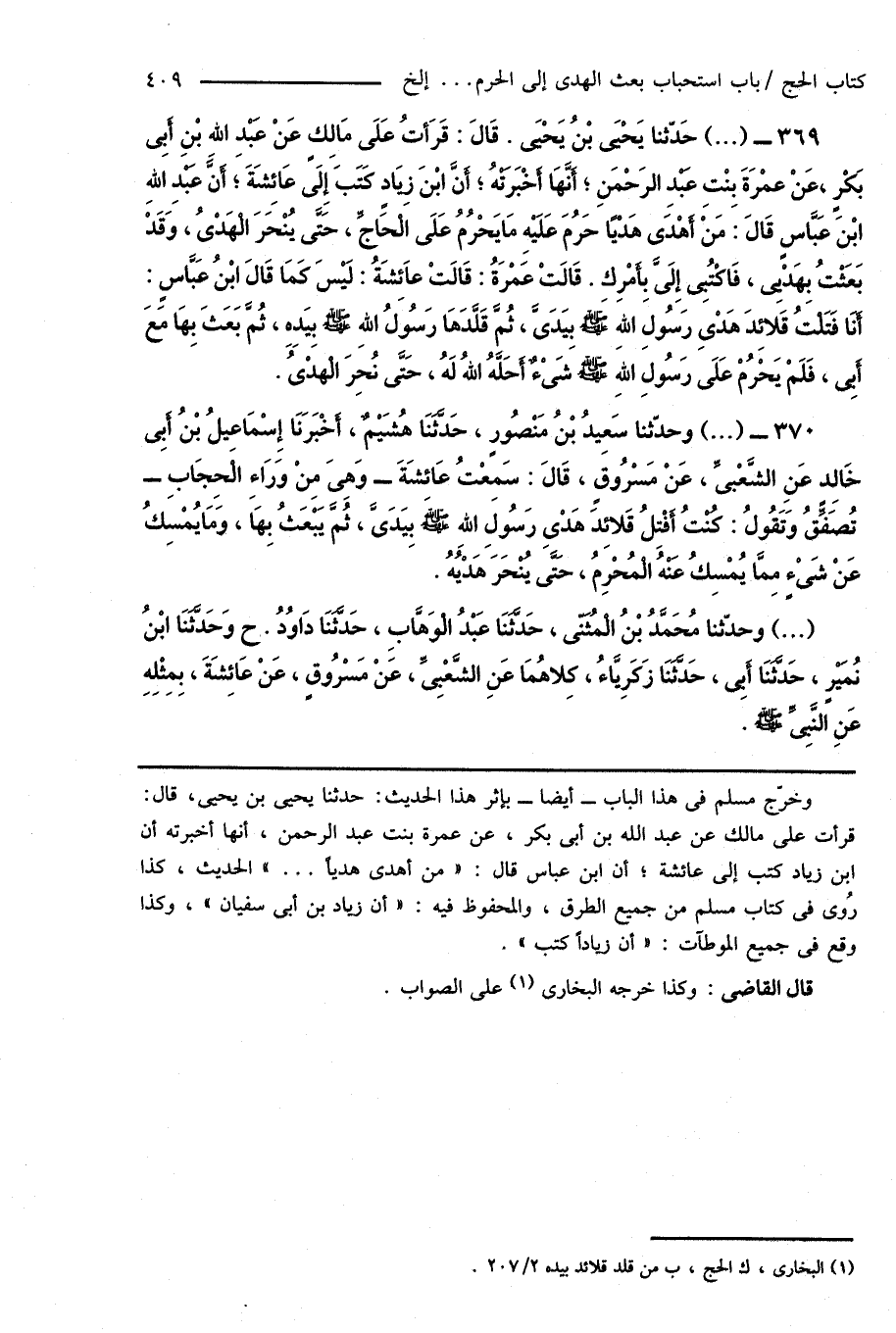 370 - (...) وحدّثنا سَعِيدُ بْنُ مَنْصُورٍ، حَدَّثَنَا هُشَيْمٌ، أَخْبَرَنَا إِسْمَاعِيلُ بْنُ أَبِى خَالِدٍ عَنِ الشَّعْبِىِّ، عَنْ مَسْرُوقٍ، قَالَ: سَمِعْتُ عَائِشَةَ - وَهِىَ مِنْ وَرَاءِ الْحِجَابِ - تُصَفِّقُ وَتَقُولُ: كُنْتُ أَفْتِلُ قَلائِدَ هَدْىِ رَسُولِ اللهِ صَلَّى اللهُ عَلَيْهِ وَسَلَّمَ بِيَدَىَّ، ثُمَّ يَبْعَثُ بِهَا، وَمَا يُمْسِكُ عَنْ شَىْءٍ مِمَّا يُمْسِكُ عَنْهُ الْمُحْرِمُ، حَتَّى يُنْحَرَ هَدْيُهُ.