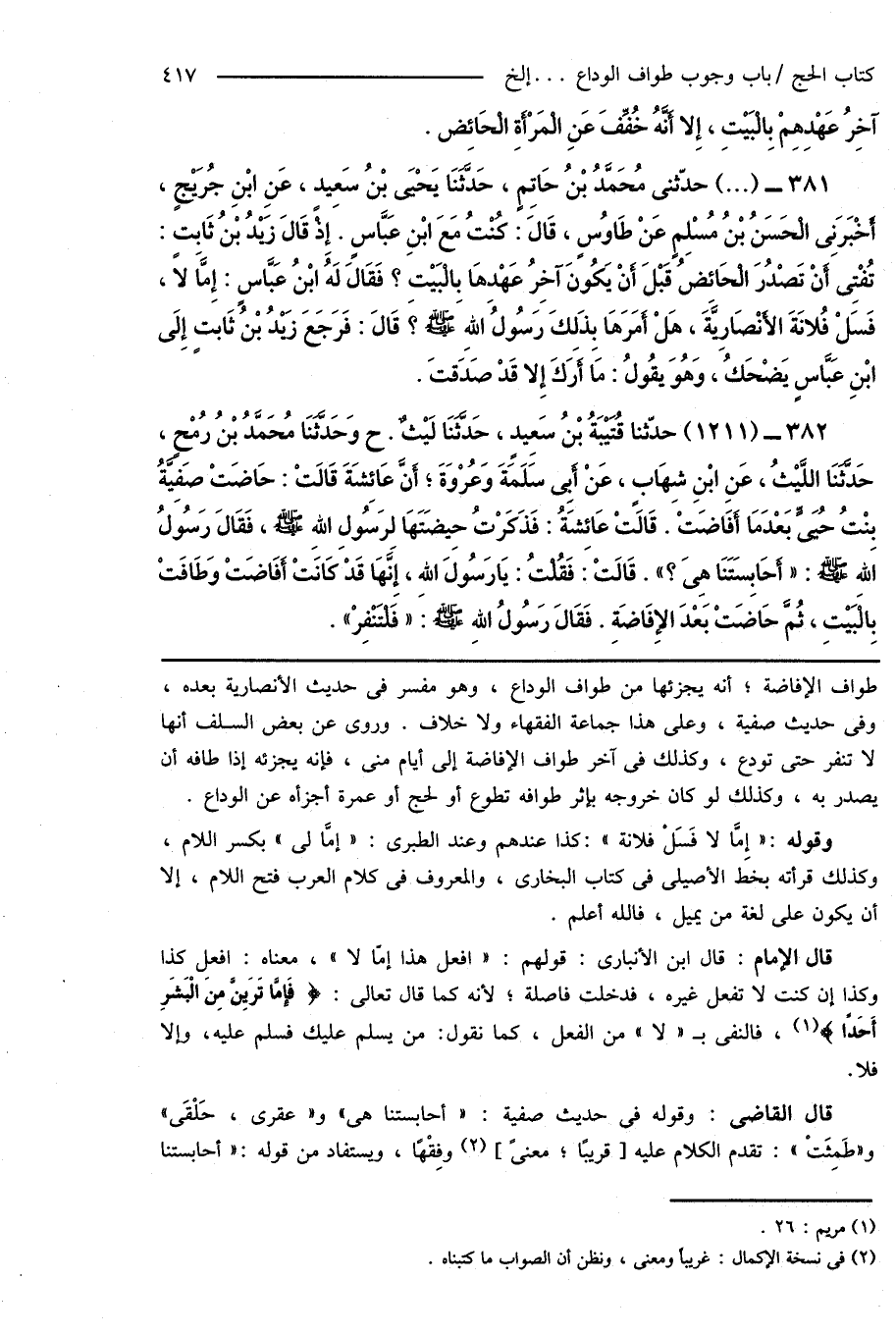 382 - (1211) حدَّثنا قُتَيْبَةُ بْنُ سَعِيدٍ، حَدَّثَنَا لَيْثٌ. ح وَحَدَّثَنَا مُحَمَّدُ بْنُ رُمْحٍ، حَدَّثَنَا اللَّيْثُ، عَنِ ابْنِ شِهَابٍ، عَنْ أَبِى سَلَمَةَ وَعُرْوَةَ، أَنَّ عَائِشَةَ قَالَتْ: حَاضَتْ صَفِيَّةُ بِنْتُ حُيَىٍّ بَعْدَمَا أَفَاضَتْ. قَالَتْ عَائِشَةُ: فَذَكَرْتُ حيضَتَهَا لِرَسُولِ اللهِ صَلَّى اللهُ عَلَيْهِ وَسَلَّمَ، فَقَالَ رَسُولُ اللهِ صَلَّى اللهُ عَلَيْهِ وَسَلَّمَ: " أَحَابِسَتَنَا هِىَ؟ ". قَالَتْ: فَقُلْتُ: يَا رَسُولَ اللهِ، إِنَّهَا قَدْ كَانَتْ أَفَاضَتْ وَطَافَتْ بِالْبَيْتِ، ثُمَّ حَاضَتْ بَعْدَ الإِفَاضَةِ. فَقَالَ رَسُولُ اللهِ صَلَّى اللهُ عَلَيْهِ وَسَلَّمَ: " فَلْتَنْفِرْ ".