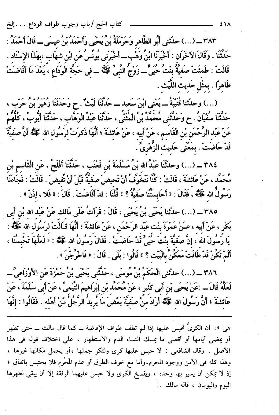 383 - (...) حدَّثنى أَبُو الطَّاهِرِ وَحَرْمَلَةُ بْنُ يَحْيَى وَأَحْمَدُ بْنُ عِيسَى - قَالَ أَحْمَدُ: حَدَّثَنَا. وَقَالَ الآخَرَانِ: أَخْبَرَنَا ابْنُ وَهْبٍ - أَخْبَرَنِى يُونُسُ عَنِ ابْنِ شِهَابٍ، بِهَذَا الإِسْنَادِ. قَالَتْ: طَمِثَتْ صَفِيَّةُ بِنْتُ حُيَىٍّ - زَوْجُ النَّبِىِّ صَلَّى اللهُ عَلَيْهِ وَسَلَّمَ - فِى حَجَّةِ الْوَدَاعِ، بَعْدَ مَا أَفَاضَتْ طَاهِرًا. بِمِثْلِ حَدِيثِ اللَّيْثِ.