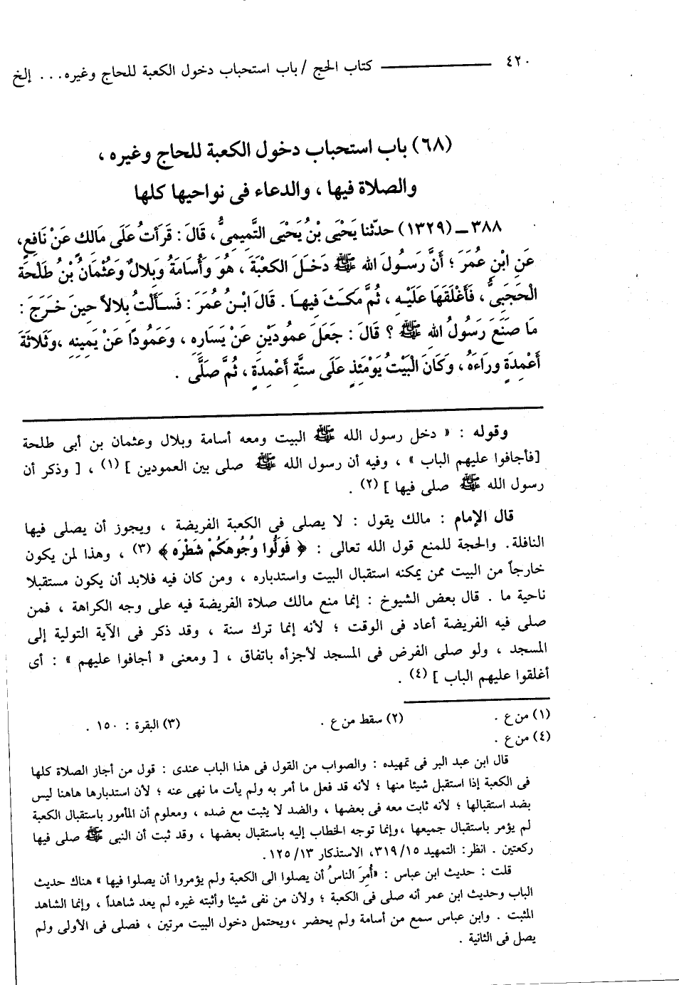 388 - (1329) حدّثنا يَحْيَى بْنُ يَحْيَى التَّمِيمِىُّ، قَالَ: قَرَأْتُ عَلَى مَالِكٍ عَنْ نَافِعٍ، عَنِ ابْن عُمَرَ؛ أَنَّ رَسُولَ اللهِ صَلَّى اللهُ عَلَيْهِ وَسَلَّمَ دَخَلَ الكعْبَةَ، هُوَ وَأُسَامَةُ وَبِلالٌ وَعُثْمَانُ بْنُ طَلْحَة الْحَجَبِىُّ، فَأَغْلَقَهَا عَلَيْهِ، ثُمَّ مَكَثَ فِيهَا. قَالَ ابْنُ عُمَرَ: فَسَأَلْتُ بِلالاً حِينَ خَرَجَ: مَا صَنَعَ رَسُولُ اللهِ صَلَّى اللهُ عَلَيْهِ وَسَلَّمَ؟ قَالَ: جَعَلَ عمُودَيْنِ عَنْ يَسَارِهِ، وَعَمُودًا عَنْ يَمِينِهِ، وَثَلاثَةَ أَعْمِدَةٍ ورَاءَهُ، وَكَانَ الْبَيْتُ يَوْمَئِذٍ عَلَى سِتَّةِ أَعْمِدَةٍ، ثُمَّ صَلَّى.