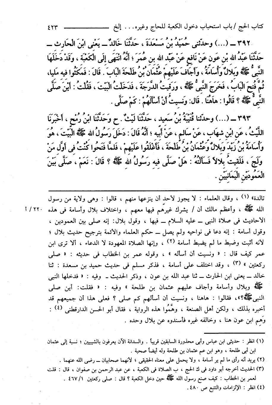 392 - (...) وحدّثنى حُمَيْدُ بْنُ مَسْعَدَةَ، حَدَّثَنَا خَالِدٌ - يَعْنِى ابْنَ الْحَارِثِ - حَدَّثَنَا عَبْدُ اللهِ بْنِ عَونٍ عَنْ نَافِعٍ عَنْ عَبْدِ اللهِ بِنِ عُمَرَ؛ أَنَّهُ انْتَهَى إِلَى الْكَعْبَةِ، وَقَدْ دَخَلَهَا النَّبِىُّ صَلَّى اللهُ عَلَيْهِ وَسَلَّمَ وَبِلالٌ وَأُسَامَةُ، وَأَجَافَ عَلَيْهِم عُثْمَانُ بْنُ طَلْحَةَ الْبَابَ. قَالَ: فَمَكَثُوا فِيه مَلِيًّا، ثُمَّ فُتِحَ الْبَابُ، فَخَرَجَ النَّبِىُّ صَلَّى اللهُ عَلَيْهِ وَسَلَّمَ، وَرَقِيتُ الدَّرَجَةَ، فَدَخَلْتُ الْبَيْتَ، فَقُلْتُ: أَيْنَ صَلَّى النَّبِىُّ صَلَّى اللهُ عَلَيْهِ وَسَلَّمَ؟ قَالُوا: هَاهُنَا. قَال: وَنسِيتُ أَنْ أَسْأَلَهُمْ: كَمْ صَلَّى.