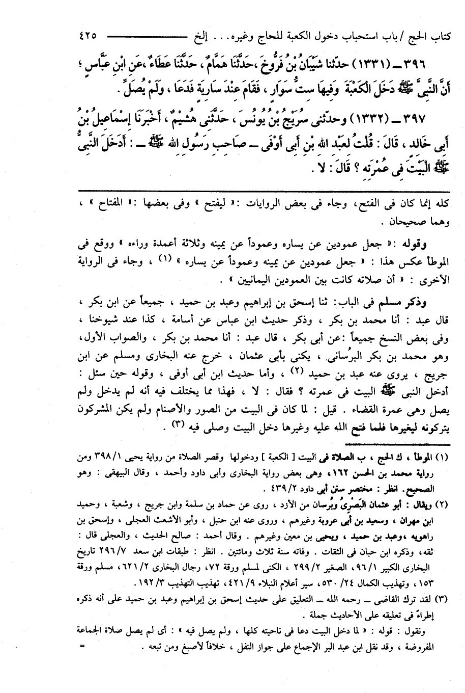 وذكر مسلم فى الباب: ثنا إسحاق بن إبراهيم وعبد بن حميد، جميعاً عن ابن بكر، قال عبد: أنا محمد بن بكر، وذكر حديث ابن عباس عن أسامة، كذا عند شيوخنا، وفى بعض النسخ جميعاً: عن أبى بكر، قال عبد: أنا محمد بن بكر، والصواب الأول، وهو محمد بن بكر البرسانى، يكنى بأبى عثمان، خرج عنه البخارى ومسلم عن ابن جريج، يروى عنه عبد بن حميد (¬2)، وأما حديث ابن أبى أوفى، وقوله حين سئل: أدخل النبى صَلَّى اللهُ عَلَيْهِ وَسَلَّمَ البيت فى عمرته؟ فقال: لا، فهذا مما يختلف فيه أنه لم يدخل ولم يصل وهى عمرة القضاء. قيل: لما كان فى البيت من الصور والأصنام ولم يكن المشركون يتركونه ليغيرها فلما فتح الله عليه وغيرها دخل البيت وصلى فيه (¬3).