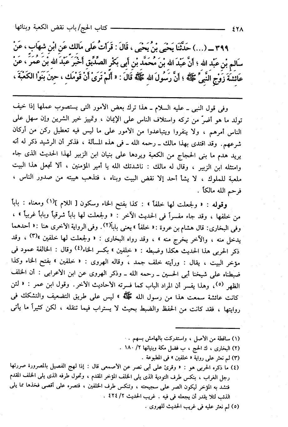 399 - (...) حَدَّثَنَا يَحْيَى بْنُ يَحْيَى، قَالَ: قَرَأْتُ عَلى مَالِكٍ عَنِ ابْنِ شِهَابٍ، عَنْ سَالِمِ بْنِ عَبْدِ اللهِ؛ أَنَّ عَبْدَ اللهِ بْنَ مُحَمَّدِ بْنِ أَبِى بَكْرٍ الصِّدِّيقِ أَخْبَرَ عَبْدَ اللهِ بْنَ عُمَرَ، عَنْ عَائِشَةَ زَوْجِ النَّبِىِّ صَلَّى اللهُ عَلَيْهِ وَسَلَّمَ؛ أَنَّ رَسُولَ اللهِ صَلَّى اللهُ عَلَيْهِ وَسَلَّمَ قَالَ: " أَلمْ تَرَىْ أَن قَوْمَكِ، حِينَ بَنَوْا الكَعْبَةَ،