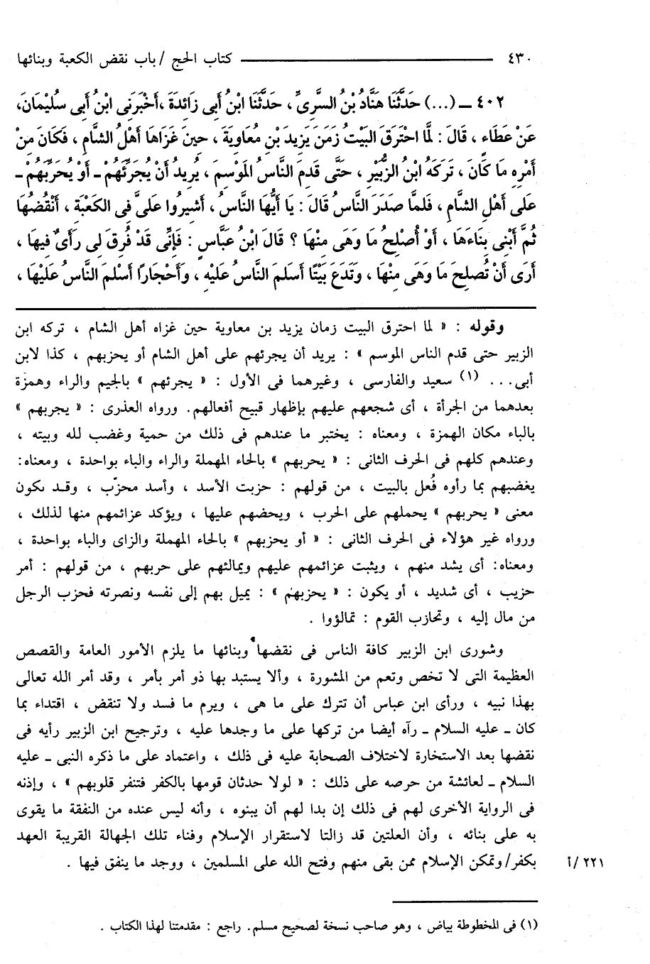 402 - (...) حَدَّثَنَا هَنَّادُ بْنُ السَّرِىِّ، حَدَّثَنَا ابْنُ أَبِى زَائِدَةَ، أَخْبَرَنِى ابْنُ أَبِى سُليْمَانَ، عَنْ عَطَاءٍ، قَالَ: لَمَّا احْتَرَقَ البَيْتُ زَمَنَ يَزِيدَ بْنِ مُعَاوِيَةَ، حِينَ غَزَاهَا أَهْلُ الشَّامِ، فَكَانَ مِنْ أَمْرِهِ مَا كَانَ، تَرَكَهُ ابْنُ الزُّبَيْرِ، حَتَّى قَدِمَ النَّاسُ المَوْسِمَ، يُرِيدُ أَنْ يُجَرِّئَهُمْ - أَوْ يُحَرِّبَهُمْ - عَلى أَهْلِ الشَّامِ، فَلمَّا صَدَرَ النَّاسُ قَالَ: يَا أَيُّهَا النَّاسُ، أَشِيرُوا عَلىَّ فِى الكَعْبَةِ، أَنْقُضُهَا ثُمَّ أَبْنِى بِنَاءَهَا، أَوْ أُصْلِحُ مَا وَهَى مِنْهَا؟ قَالَ ابْنُ عَبَّاسٍ: فَإِنِّى قَدْ فُرِقَ لِى رَأَىٌ فِيهَا، أَرَى أَنْ تُصلِحَ مَا وَهَى مِنْهَا، وَتَدَعَ بَيْتًا أَسلمَ النَّاسُ عَليْهِ، وَأَحْجَارًا أَسْلمَ النَّاسُ عَلَيْهَا،
