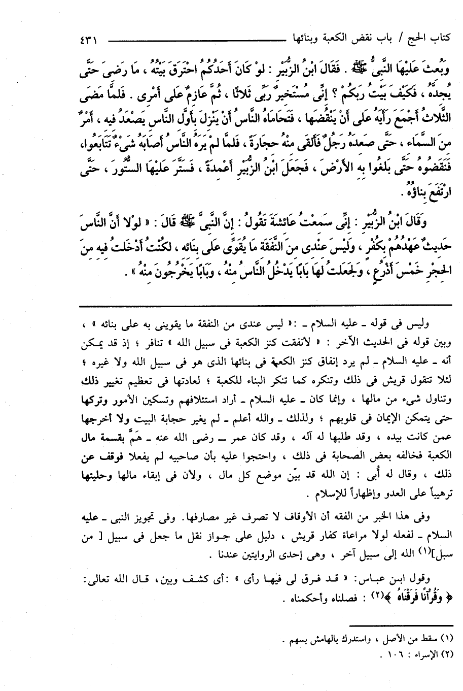 وليس فى قوله - عليه السلام -: " ليس عندى من النفقة ما يقوينى به على بنائه "، وبين قوله فى الحديث الآخر: " لأنفقت كنز الكعبة فى سبيل الله " تنافر؛ إذ قد يمكن أنه - عليه السلام - لم يرد إنفاق كنز الكعبة فى بنائها الذى هو فى سبيل الله ولا غيره؛ لئلا تتقول قريش فى ذلك وتنكره كما تنكر البناء للكعبة؛ لعادتها فى تعظيم تغيير ذلك وتناول شىء من مالها، وإنما كان - عليه السلام - أراد استئلافهم وتسكين الأمور وتركها حتى يتمكن الإيمان فى قلوبهم؛ ولذلك - والله أعلم - لم يغير حجابة البيت ولا أخرجها عمن كانت بيده، وقد طلبها له آله، وقد كان عمر - رضى الله عنه - هَمَّ بقسمة مال الكعبة فخالفه بعض الصحابة فى ذلك، واحتجوا عليه بأن صاحبيه لم يفعلا فوقف عن ذلك، وقال له أُبى: إن الله قد بيّن موضع كل مال، ولأن فى إبقاء مالها وحليتها ترهيباً على العدو وإظهاراً للإسلام.