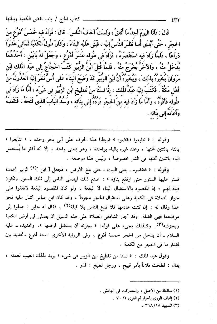 وقوله: " فنقضوه - يعنى البيت - حتى بلغ الأرض، فجعل [ابن] (¬1) الزبير أعمدة فستر عليها الستور حتى ارتفع بناؤه ": صنع ذلك ليصلى الناس إلى تلك الستور وتكون قبلة لهم؛ إذ المقصود بالاستقبال البناء لا البقعة، ولو كان المقصود البقعة لاتفقوا على جواز الصلاة فى الكعبة وعلى استقبال الحجر مجرداً، وقد كان ابن عباس أشار عليه نحو هذا وقال له: إن كنت هادمها فلا تدع الناس بلا قبلة (¬2)، فقال له جابر: صلوا إلى موضعها فهى القبلة. وقد أجاز الشافعى الصلاة على هذه السبيل أن يصلى فى أرض الكعبة ويجزئه (¬3). وكذلك يجىء على قوله: " يجزئه أن يستقبل أرضها ". وتحديده - عليه السلام - أن يدخل من الحجر خمسة أذرع، وفى الرواية الأخرى: ستة أذرع، تحديد بين لمقدار ما فى الحجر من الكعبة.