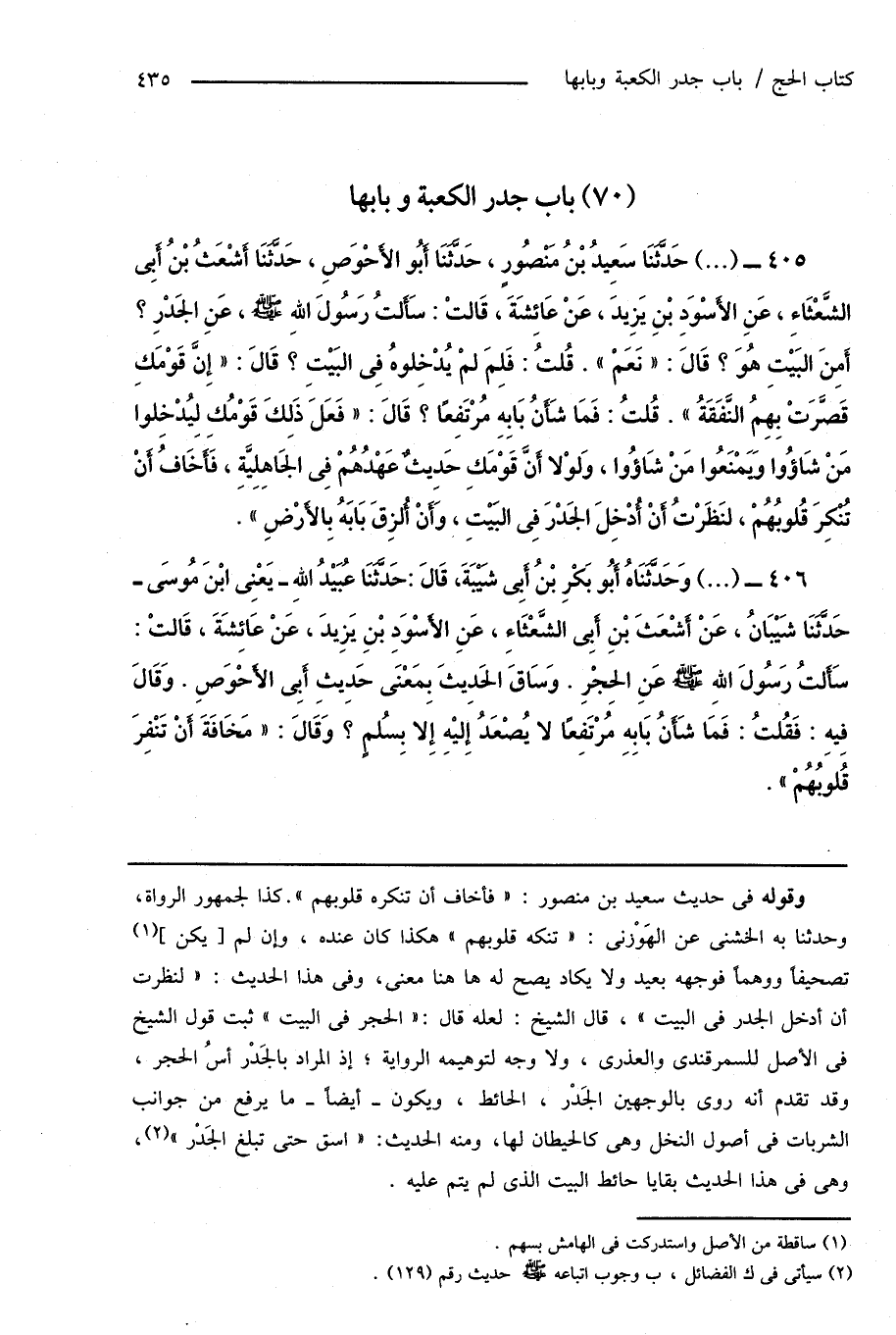 405 - (...) حَدَّثَنَا سَعِيدُ بْنُ مَنْصُورٍ، حَدَّثَنَا أَبُو الأَحْوَصِ، حَدَّثَنَا أَشْعَثُ بْنُ أَبِى الشَّعْثَاءِ، عَنِ الأَسْوَدِ بْنِ يَزِيدَ، عَنْ عَائِشَةَ، قَالَتْ: سَأَلتُ رَسُولَ اللهِ صَلَّى اللهُ عَلَيْهِ وَسَلَّمَ، عَنِ الجَدْرِ؟ أَمِنَ البَيْتِ هُوَ؟ قَالَ: " نَعَمْ ". قُلْتُ: فَلِمَ لمْ يُدْخِلوهُ فِى البَيْتِ؟ قَالَ: " إِنَّ قَوْمَكِ قَصَّرَتْ بِهِمُ النَّفَقَةُ ". قُلْتُ: فَمَا شَأْنُ بَابِه مُرْتَفِعًا؟ قَالَ: " فَعَلَ ذَلِكَ قَوْمُكِ لِيُدْخِلوا مَن شَاؤُوا وَيَمْنَعُوا مَنْ شَاؤُوا، وَلوْلا أَنَّ قَوْمَكِ حَدِيثٌ عَهْدُهُمْ فِى الجَاهِلِيَّةِ، فَأَخَافُ أَنْ تُنْكِرَ قُلوبُهُمْ، لنَظَرْتُ أَنْ أُدْخِلَ الجَدْرَ فِى البَيْتِ، وَأَنْ أُلْزِقَ بَابَهُ بِالأَرْضِ ".