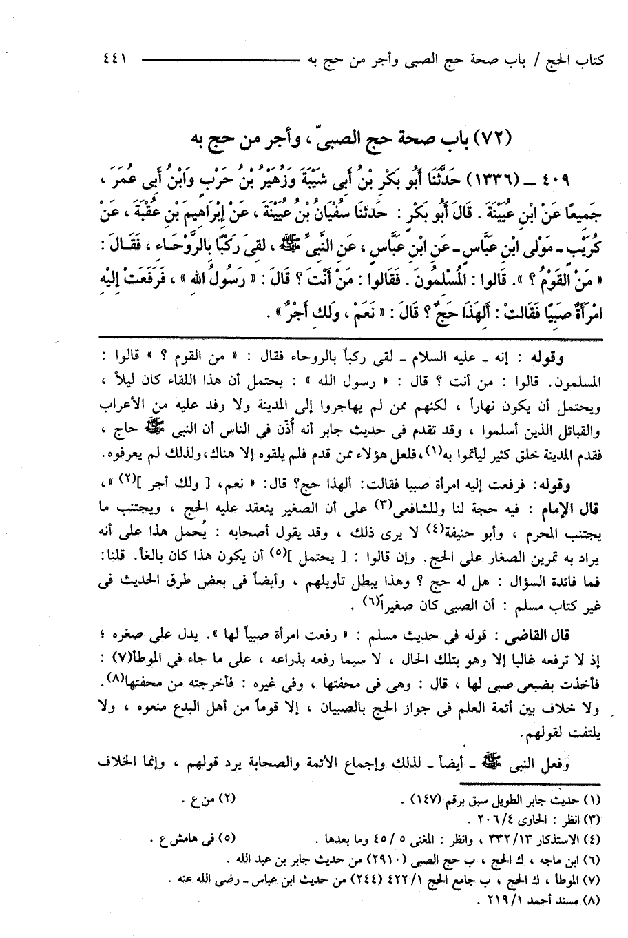 409 - (1336) حَدَّثَنَا أَبُو بَكْرِ بْنُ أَبِى شَيْبَةَ وَزُهَيْرُ بْنُ حَرْبٍ وَابْنُ أَبِى عُمَرَ، جَمِيعًا عَنْ ابْنِ عُيَيْنَةَ. قَالَ أَبُو بَكْر: حَدَّثَنَا سُفْيَانُ بْنُ عُيَيْنَةَ، عَنْ إِبْرَاهِيمَ بْنِ عُقْبَةَ، عَنْ كُرَيْبٍ - مَوْلى ابْنِ عَبَّاسٍ - عَنْ ابْنِ عَبَّاسٍ، عَنِ النَّبِىِّ صَلَّى اللهُ عَلَيْهِ وَسَلَّمَ، لقِىَ رَكْبًا بِالَرَّوْحَاءِ، فَقَالَ: " مَنْ القَوْمُ؟ ". قَالوا: المُسْلِمُونَ. فَقَالوا: مَنْ أَنْتَ؟ قَالَ: " رَسُولُ اللهِ "، فَرَفَعَتْ إِليْهِ امْرَأَةٌ صَبِيًا فَقَالتْ: أَلِهَذَا حَجٌّ؟ قَالَ: " نَعَمْ، وَلكِ أَجْرٌ ".