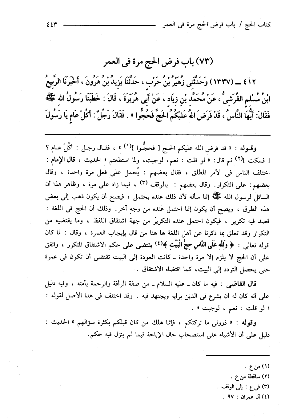 412 - (1337) وَحَدَّثَنِى زُهَيْرُ بْنُ حَرْبٍ، حَدَّثَنَا يَزِيدُ بْنُ هَارُونَ، أَخْبَرَنَا الرَّبِيعُ ابْنُ مُسْلِمٍ القُرَشِىُّ، عَنْ مُحَمَّدِ بْنِ زِيَادٍ، عَنْ أَبِى هُرَيْرَةَ، قَالَ: خَطَبَنَا رَسُولُ اللهِ صَلَّى اللهُ عَلَيْهِ وَسَلَّمَ فَقَالَ: أَيُّهَا النَّاسُ، قَدْ فَرَضَ اللهُ عَلَيْكُمُ الحَجَّ فَحُجُّوا ". فَقَالَ رَجُلٌ: أَكُلّ عَامٍ يَا رَسُولَ