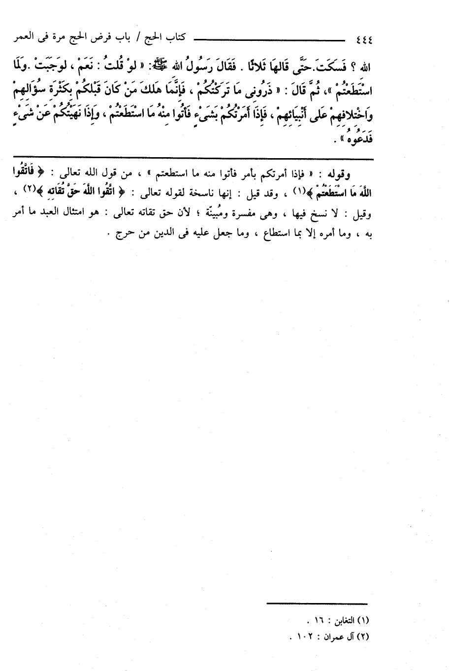 وقوله: " فإذا أمرتكم بأمر فأتوا منه ما استطعتم "، من قول الله تعالى: {فَاتَّقُوا اللَّهَ مَا اسْتَطَعْتُمْ} (¬1)، وقد قيل: إنها ناسخة لقوله تعالى: {اتَّقُوا اللَّهَ حَقَّ تُقَاتِهِ} (¬2)، وقيل: لا نسخ فيها، وهى مفسرة ومُبينّة؛ لأن حق تقاته تعالى: هو امتثال العبد ما أمر به، وما أمره إلا بما استطاع، وما جعل عليه فى الدين من حرج.