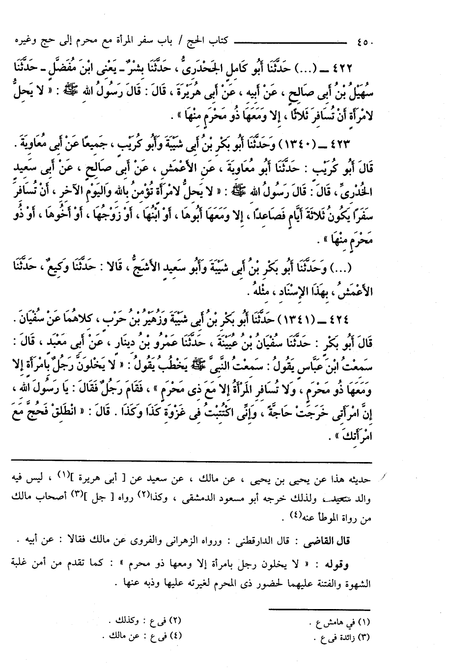 422 - (...) حَدَّثَنَا أَبُو كَامِلٍ الجَحْدَرِىُّ، حَدَّثَنَا بِشْرٌ - يَعْنِى ابْنَ مُفَضَّلٍ - حَدَّثَنَا سُهَيْلُ بْنُ أَبِى صَالِحٍ، عَنْ أَبِيهِ، عَنْ أَبِى هُرَيْرَةَ، قَالَ: قَالَ رَسُولُ اللهِ صَلَّى اللهُ عَلَيْهِ وَسَلَّمَ: " لا يَحِلُّ لامْرَأَةٍ أَنْ تُسَافِرَ ثَلَاثًا، إِلا وَمَعَهَا ذُو مَحْرَمٍ مِنْهَا ".